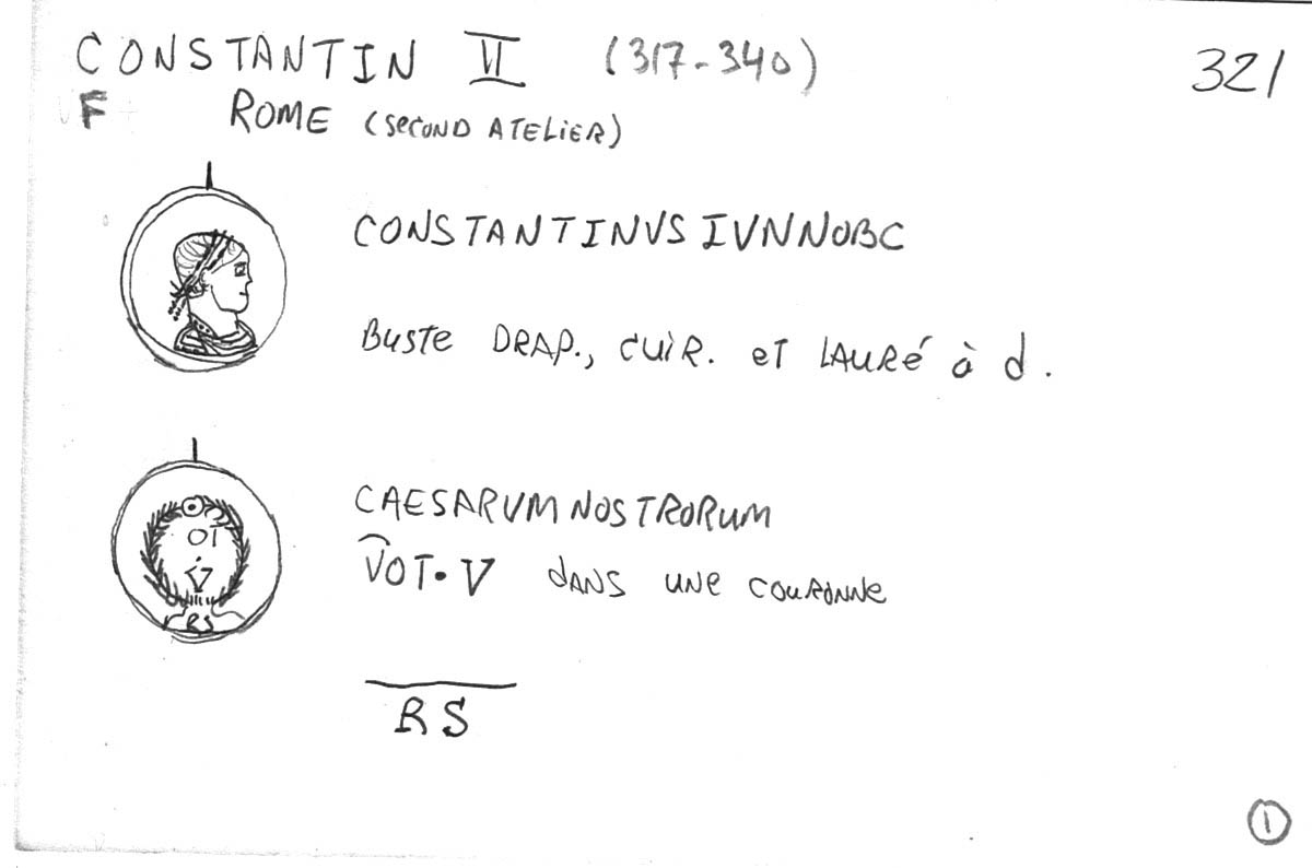 D’après le RIC (Bruun P.M., Ed. by Sutherland C.H.V. & Carson R.A.G., The Roman Imperial Coinage vol. VII: Constantine and Licinius (313-337). London: Spink & Son, 1966, p. 321), cette pièce aurait été frappée par la deuxième officine de l’atelier de Rome en 321.