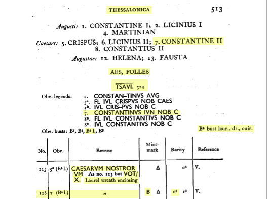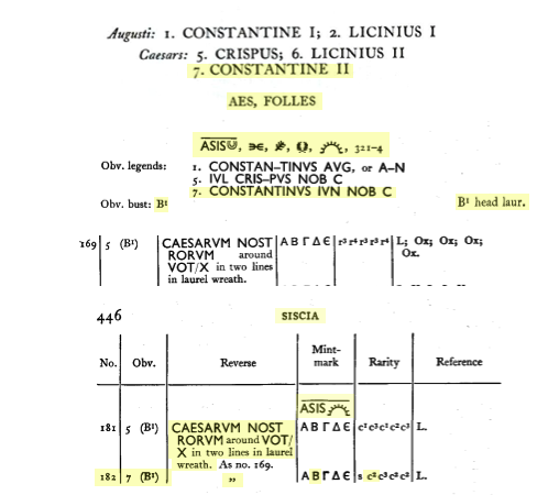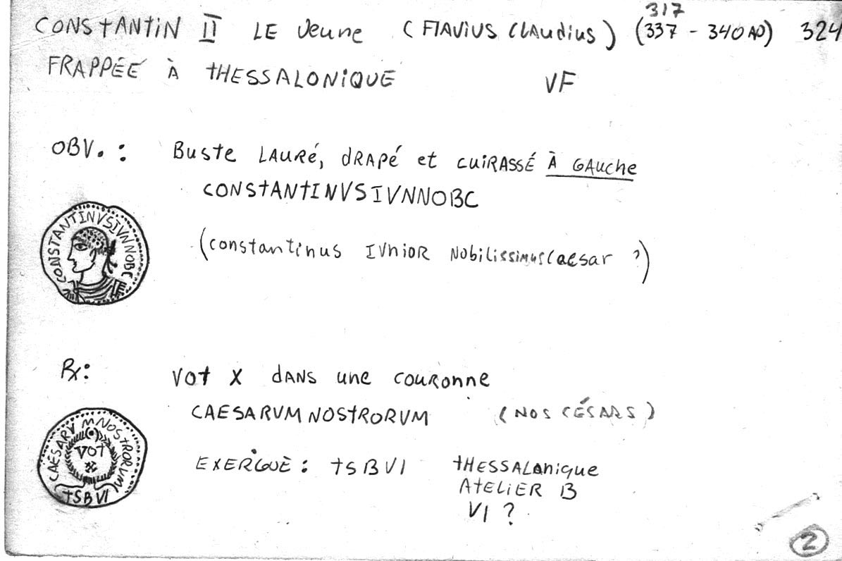 Sources: Wikipedia (Constantinus II [FR/EN]), FAC (Constantinus II,Caesarvm Nostrorvm,laurel wreath, Siscia, vota, wreath), ERIC (Constantinus II); RIC v. 7: Siscia #182; Thessalonica # 128; Online réf. pour la pièce 1: Google, acsearch, CoinArchives, CoinProject, numismatics, r5coins, vcoins, WildWinds (text, image); Online réf. pour la pièce 2: Google, acsearch, CoinArchives, CoinProject, numismatics, r5coins, vcoins, WildWinds (text, image). Voir aussi mes fiches (Siscia, Thessalonica).