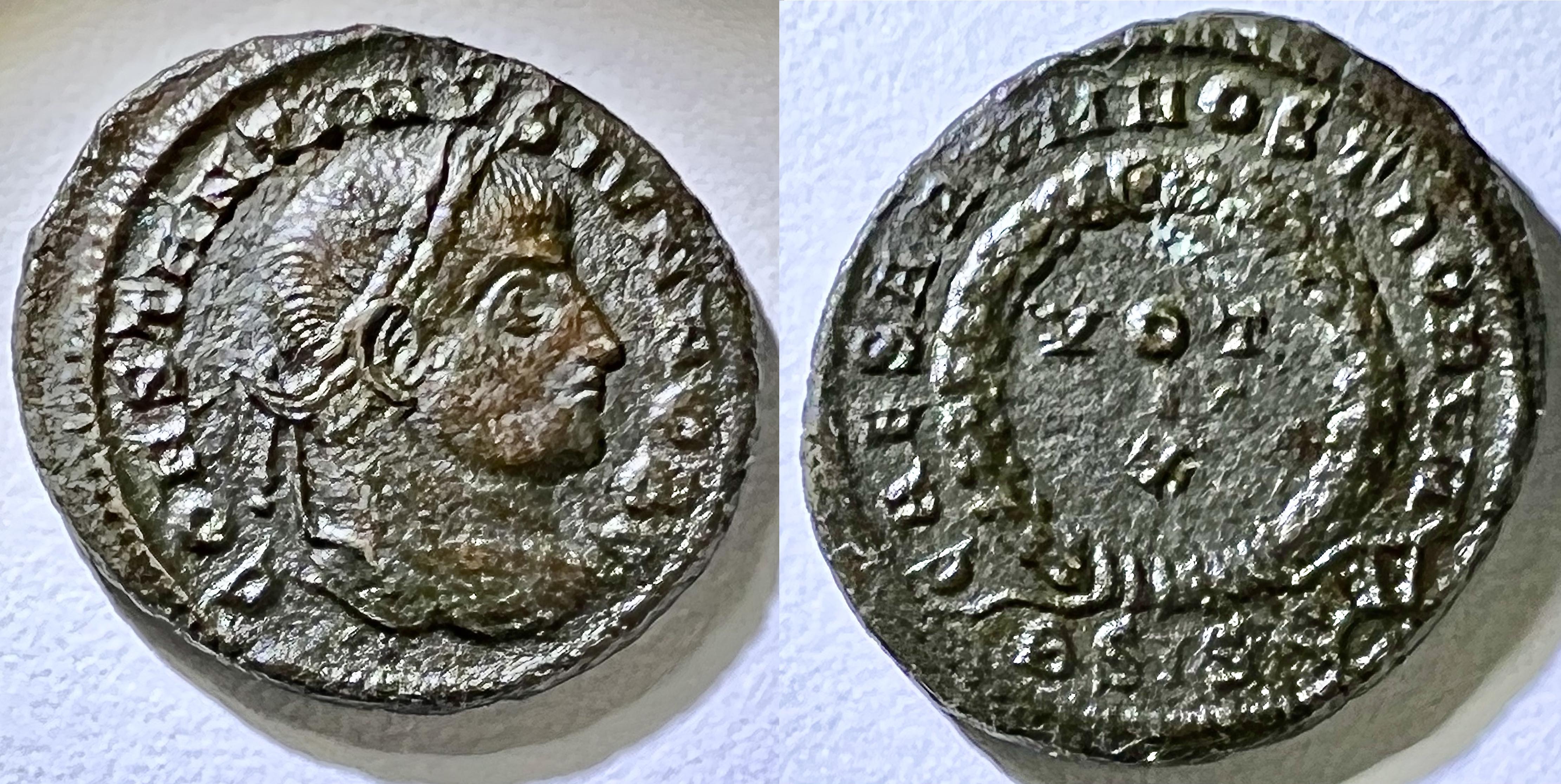La seconde pièce est plus ronde mais elle est très très belle (VF [Very Fine], 18 mm, 2.987 g, payé environ $7, patine avec dépôt verdâtre; die-axis: ↑↓). L’avers nous offre un buste du césar lauré, drapé et cuirassé à gauche, suivie de la même nomenclature que la première pièce. Le revers illustre aussi une couronne inscrite d’un VOT[IS] • X avec la même inscription mais cette fois avec un TSBVI en exergue (marque de la deuxième officine [B = Bêta] de l’atelier de Thessalonique [TS] — le chiffre romain “VI” serait possiblement une marque de séquence ou une datation qui fait référence au sixième Consulat de Constantinus en 320 [et qui ne reçoit son septième consulat qu’en 326]).