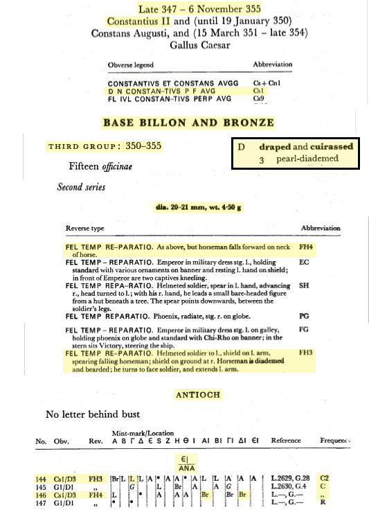 D’après le RIC (Bruun P.M., Ed. by Sutherland C.H.V. & Carson R.A.G., The Roman Imperial Coinage vol. VII: Constantine and Licinius (313-337). London: Spink & Son, 1966, p. 693, 697), cette pièce aurait été frappée par la dixième officine de l’atelier d’Antioche. Il y a deux émission possible: l’une en 330-333, 335 EC (RIC 92) et l’autre en 335-337 EC. Toutefois, la comparaison des portraits de Constantinople (particulièrement les détails du casque) et le fait que la seconde émission est plus rare me porte à croire que ma pièce appartient probablement à la première émission.