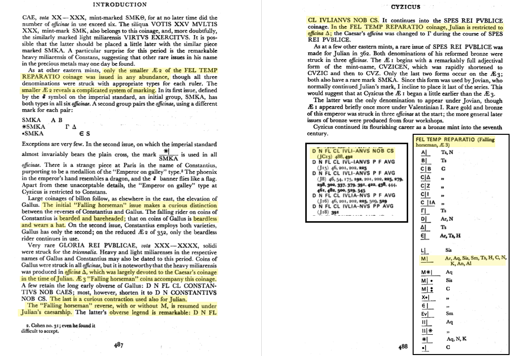 D’après le RIC (Kent, J.P.C.; Ed. by Sutherland C.H.V. & Carson R.A.G., The Roman Imperial Coinage vol. VIII: The Family Of Constantine I (337-364), London: Spink & Son, 1981, p. 486, 490-91), cette pièce aurait été frappée par l’atelier de Cyzique entre septembre 337 et avril 340 EC.