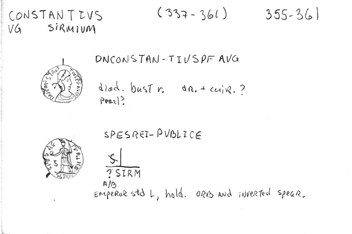[ Translate ]Sources: Wikipedia (Constantius II [FR/EN]), FAC (Constantius II, Sirmium, Spes, Spes Republicae, spiculum), ERIC (Constantius II); RIC v. VIII, Sirmium: 86; Sear RCV (1983): 3911; Online Réf.: Google, ac, acsearch, acsearch, CoinArchives, eBay, FAC, KevinCoins, Numismatics, Numista, Picckick, vcoins, WildWinds (image). Voir aussi ma fiche.