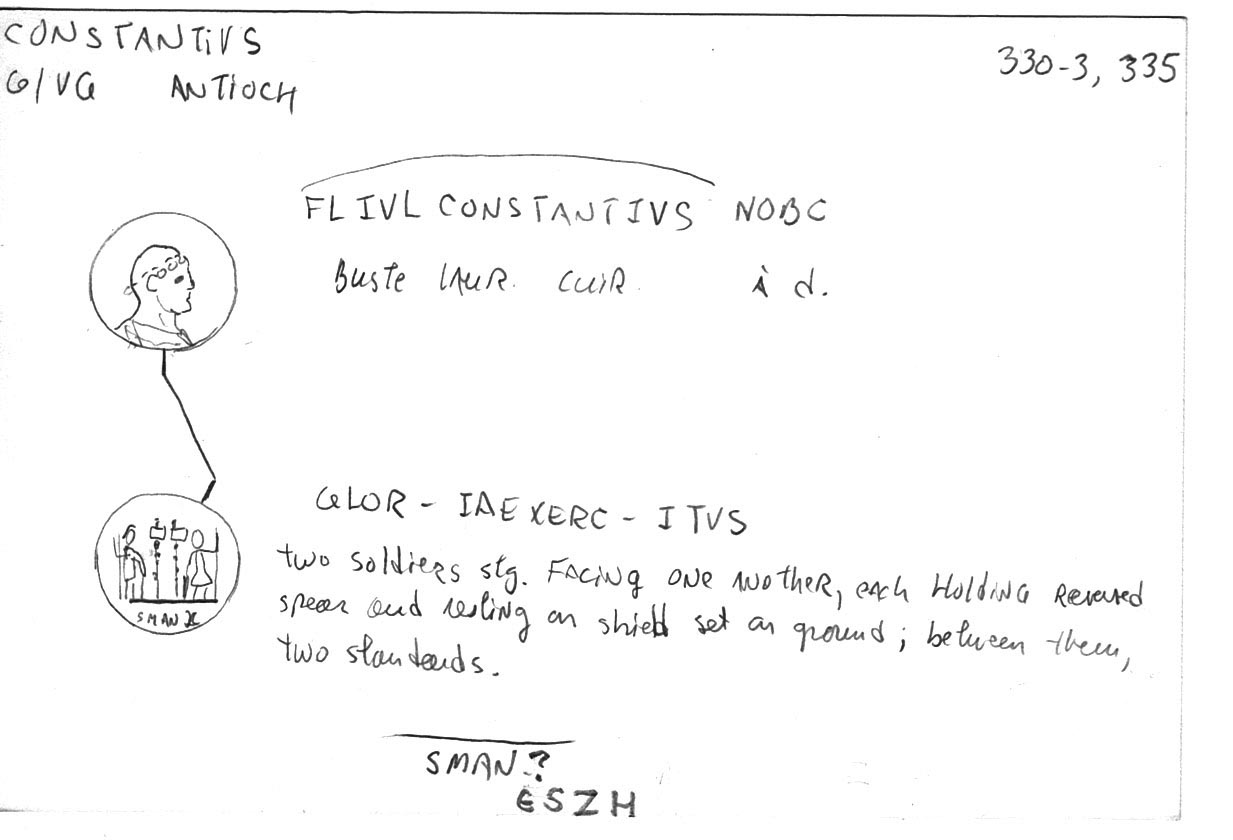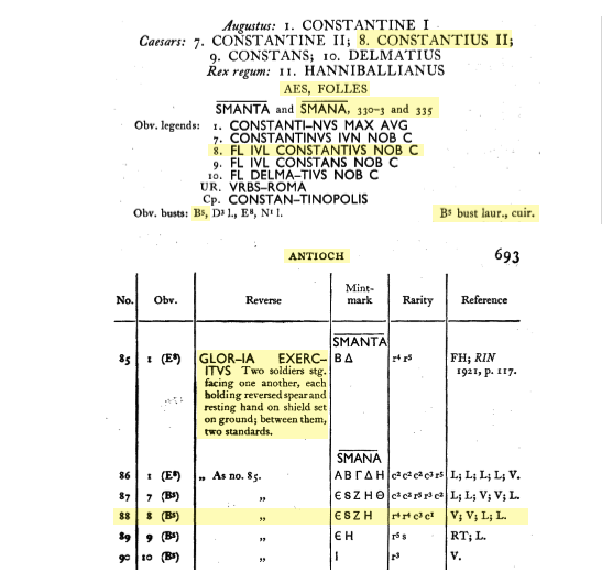 D’après le RIC (Bruun P.M., Ed. by Sutherland C.H.V. & Carson R.A.G., The Roman Imperial Coinage vol. VII: Constantine and Licinius (313-337). London: Spink & Son, 1966, p. 693), cette pièce aurait été frappée par l’atelier d’Antioche vers 330-333 ou 335 EC.