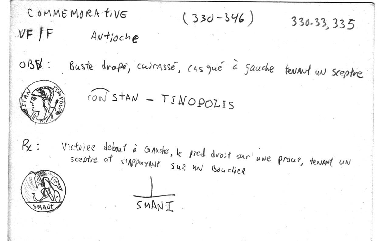 D’après le RIC (Bruun P.M., Ed. by Sutherland C.H.V. & Carson R.A.G., The Roman Imperial Coinage vol. VII: Constantine and Licinius (313-337). London: Spink & Son, 1966, p. 693, 697), cette pièce aurait été frappée par la dixième officine de l’atelier d’Antioche. Il y a deux émission possible: l’une en 330-333, 335 EC (RIC 92) et l’autre en 335-337 EC. Toutefois, la comparaison des portraits de Constantinople (particulièrement les détails du casque) et le fait que la seconde émission est plus rare me porte à croire que ma pièce appartient probablement à la première émission.