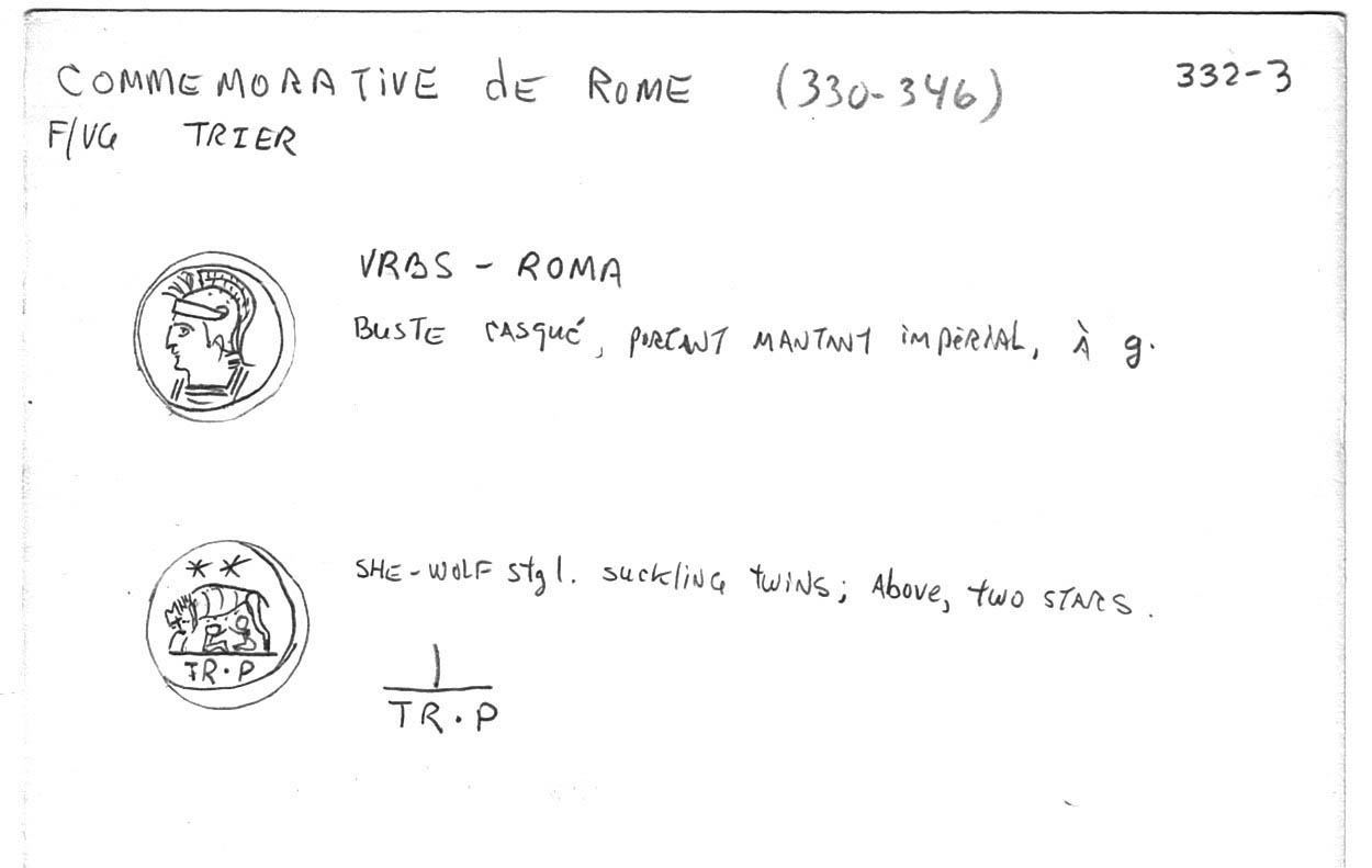 Le second specimen est une pièce commémorative de la ville de Rome. C’est un très beau nummus ou demi-centenionalis (F [Fine], AE3, AE [Bronze], 17 x 18 mm, 1.955 g, payé environ $6 le 1985/06/16, patine verdâtre le flan étant presqu’entièrement couvert de vert-de-gris; die-axis: ↑↓). L’avers présente un buste de Roma à gauche, cuirassé et drapé d’un manteau impérial, portant un casque à cimier, avec l’inscription latine VRBS – ROMA (“Ville de Rome”). Le revers illustre une louve debout à gauche, la tête tournée en arrière vers la droite, allaitant les jumeaux Romulus et Remus enfants, avec au-dessus deux étoiles (représentant les Dioscures Castor et Pollux de la constellation des Gémeaux), avec un TR • P en exergue (marque de la première officine [P = Primus] de l’atelier de Treveris [TR]). Il semble parfois y avoir, comme marque de séquence, un dessin sur l’épaule de la louve (une main, une étoile, un double croissant, etc.) mais s’il y en a un ici il est impossible de le distinguer.
