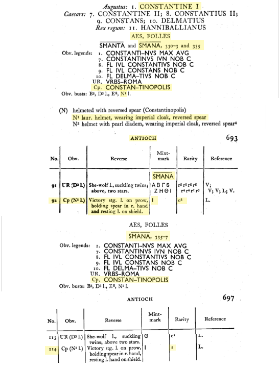 [ Translate ]Sources: Wikipedia (Constantinople [FR/EN], Rome [FR/EN]), FAC (Constantinopolis, Urbs Roma); RIC v. VII, Antioch: 92 / 114; Trier: 547; Online Ref. (Constantinopolis): Google, AC, AC, CGC, CoinArchives, MintageWorld, numismatics, vcoins, vcoins, WildWinds (RIC 92: text, image; RIC 114: text, image). Online Ref. (Roma): Google, acsearch, CGC, CoinArchives, CoinTalk, FAC, numismatics, numista, WildWinds (text, image). Voir aussi mes fiches (Constantinopolis, Roma).