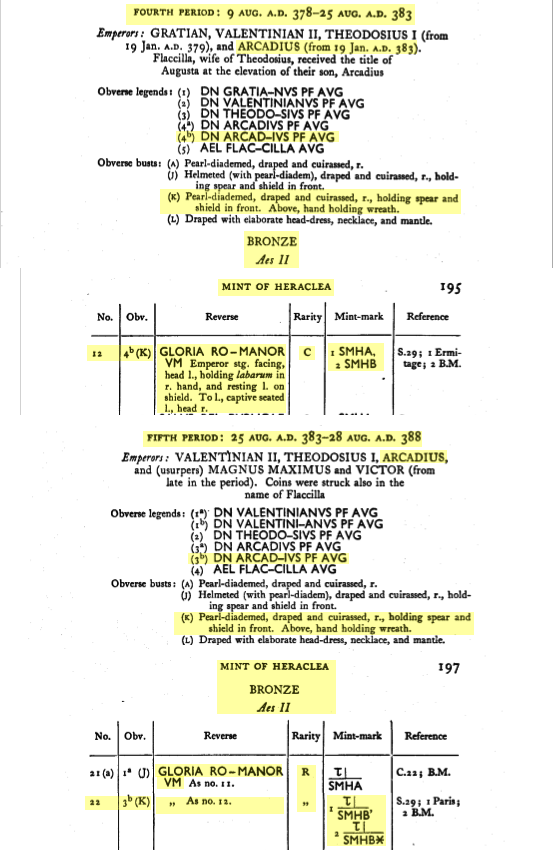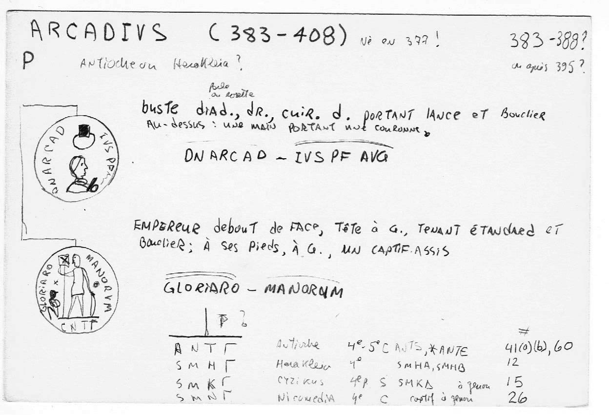 [ Translate ]Sources: Wikipedia (Arcadius [FR/EN]), FAC (Arcadius, Gloria Romanorum, labarum), ERIC (Arcadius); RIC v. IX (voir les références dans le texte); Sear RCV (1983): 4129; Ref. online: Google, acsearch, Cerberus (SMHA), CoinArchives (CON𝚪✲), CoinProject (+SMN𝚪 / T), numismatics, WildWinds (Antioch: text, image; Cyzicus: text, image; Heraclea 12 (SMHA): text, image; Heraclea 22 (SMHB✲): text, image). Voir aussi ma fiche.