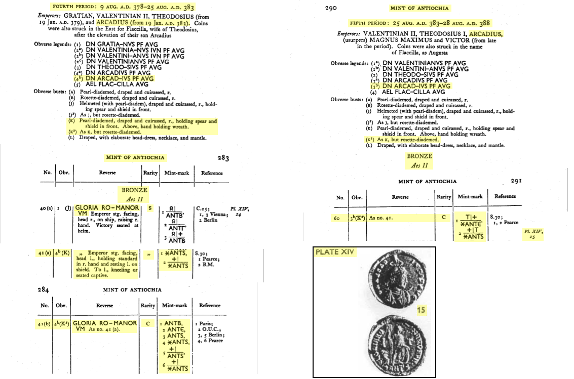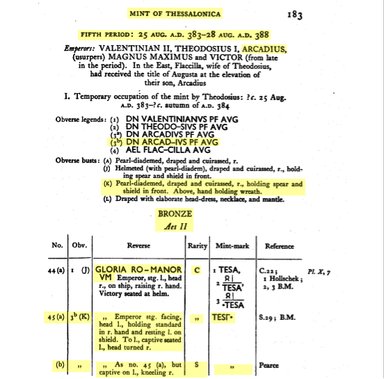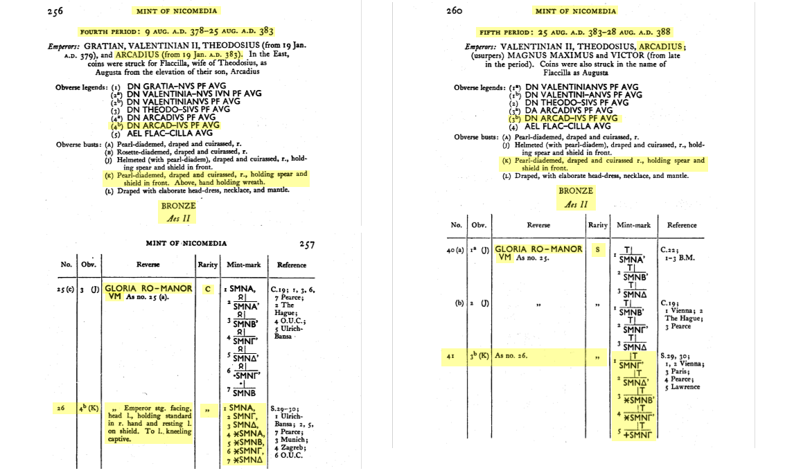 D’après le RIC (Pearce J.W.E., Edited by Mattingly H., Sutherland C.H.V. & Carson R.A.G., The Roman Imperial Coinage vol. IX: Valentinian I – Theodosius I. London: Spink & Son, 1951, pp. 311-12, 319), ce type de pièce (manus dei sur l’avers et un Gloria Romanorum avec un captif au pieds de l’empereur sur le revers) aurait été frappé par huit ateliers. La marque d’atelier pourrait donc être soit ANTS/B/Є ou ✲ANTS/Є pour Antioche (RIC IX 41a/b & 60 [pp. 283-84, 191]), soit CON𝚪/✲/A/B pour Constantinople (RIC IX 53a/b & 80 [pp. 226, 233]), soit SMK𝚫 pour Cyzique (RIC IX 15 [p. 243]), soit SMHA/B/B✲ pour Heraclée (RIC IX 12 & 22 [pp. 195, 197]), soit SMNA/𝚪/𝚫 ou ✲SMNA/B/𝚪/𝚫 pour Nicomédie (RIC IX 26 & 41 [pp. 257, 260]), soit ASISC ou ASISC• pour Siscia (RIC IX 33 [p. 153]), ou encore TES𝚪• pour Thessalonique (RIC IX 45a/b [p. 183]). À cause de la lecture du caractère M ou N en exergue, il est plus probable que la pièce ait été frappé par les ateliers de Antioche, Cyzique, Héraclée ou Nicomédie et, compte tenu de l’apparence du buste qui est petit et couvre à peine plus de la moitié de l’avers, je pencherais plus pour cette dernière. Si c’est bien le cas, et selon qu’il y ait un “T” dans le champs droit ou pas, cette pièce aurait été frappée entre le 19 janvier 383 et le 25 août 383 (absence du “T”) ou entre le 25 août 383 et le 28 août 388 (avec un “T”).