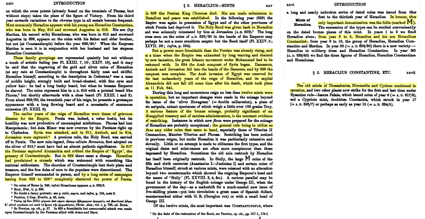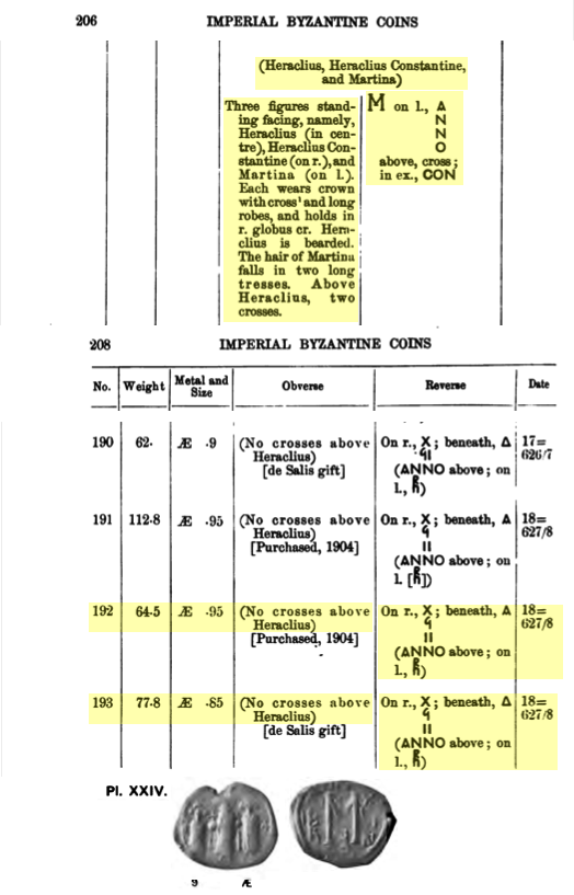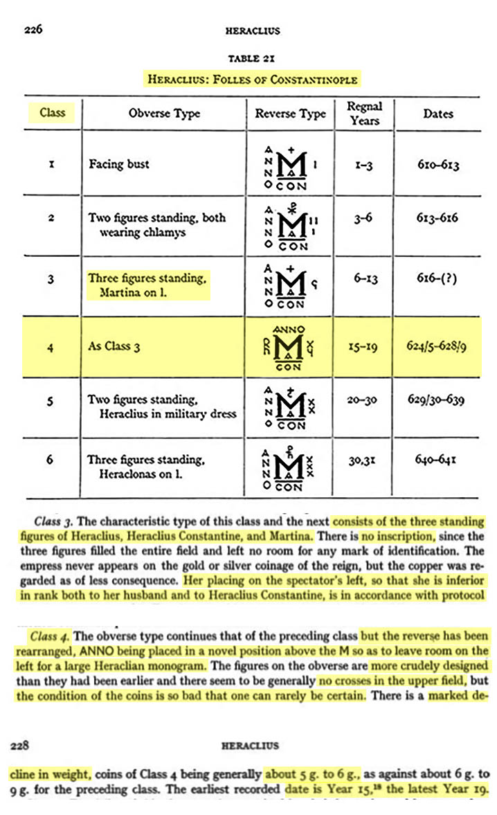 Ces informations (confirmées par WROTH, W. Catalogue of the Imperial Byzantine Coins in the BM, v. 1: pp. xxiv-xxvii, 208; et GRIERSON, Philip. Catalogue of the Byzantine Coins in the Dumbarton Oaks Collection and in the Whittemore Collection: Vol. 2, Part 1:  Phocas and Heraclius 602-641. Washington DC: Dumbarton Oaks Research Library & Collections, 1993. pp. 106-110, 226-228, 292-294) nous indiquent que ce follis a été frappée par la première ou la quatrième officine de l’atelier de Constantinople vers 624-629 EC (les années de règne quinze à dix-neuf — car c’est la seule période, dites “Class 4”, où ce type de revers a été frappé avec le “ANNO” sur le dessus — par contre, s’il s’agit bien de la dix-huitième année de règne, alors on pourrait la dater plus précisément en 627-628 EC).