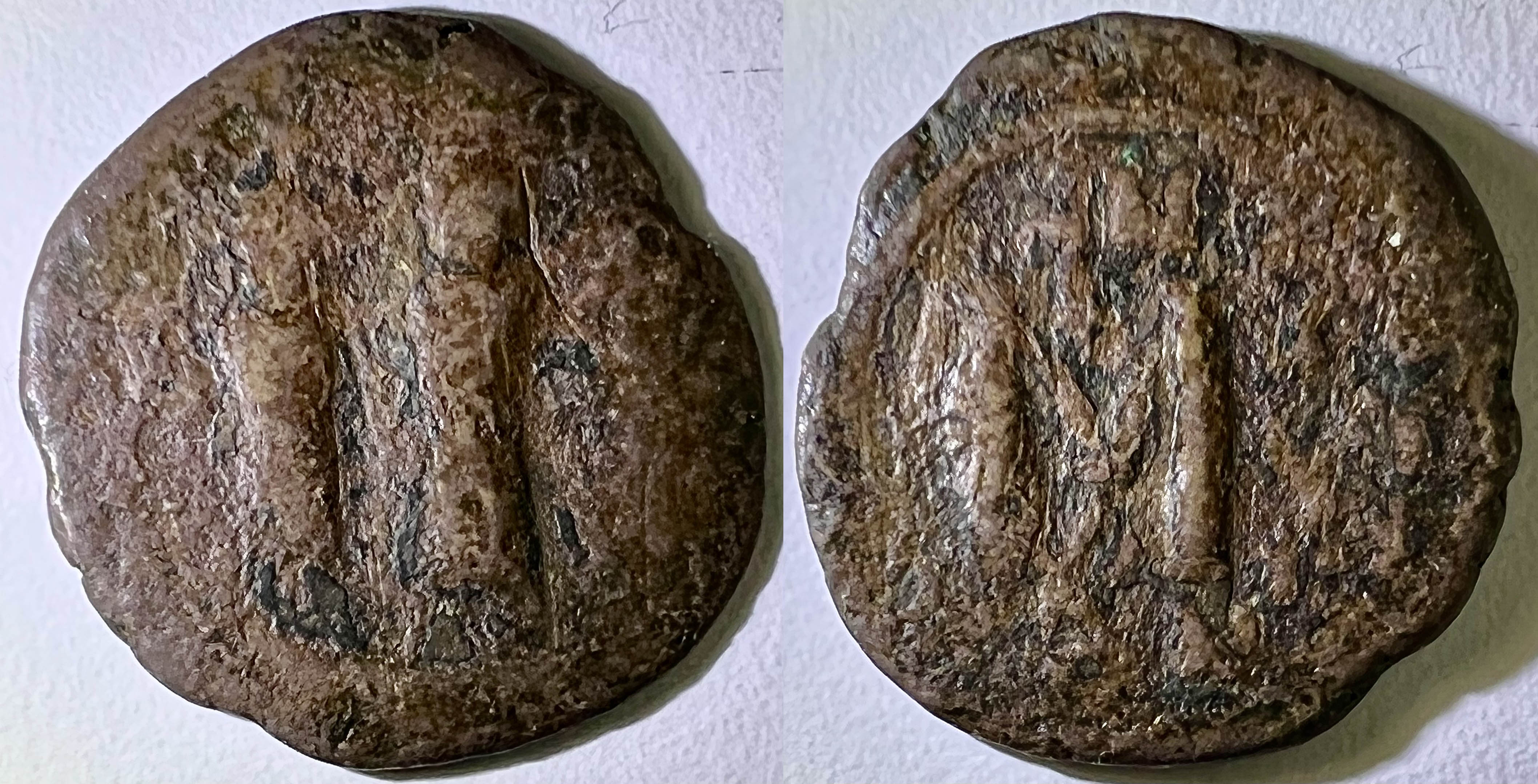IMG_1622-1628Ma deuxième pièce de monnaie d’Héraclius le représente avec son fils Heraclius Constantinus et sa deuxième épouse, Martina. Il s’agit encore malheureusement d’un follis dans un état assez médiocre (P [Poor], 40 nummi, AE [Bronze], 22 x 22.5 mm (.87 x .89 po), 3.625 g (55.9 gr), payé environ $5 le 1985/01/06, patine brune, usure et rognures considérables; die-axis: ↑↑). L’avers nous présente Heraclius entouré de son fils Heraclius Constantinus (à peine visible, à d.) et de Martina (à g.), tous couronnés, vêtus d’une chlamyde et portant un globe crucigère dans la main droite, sans aucune inscription. Le revers illustre un large “M” (marque de valeur indiquant 40 nummi), surmonté d’une petite croix et de “ANNO”, et avec un “A” ou “𝚫” en dessous (marque d’officine: Alpha = 1 ou Delta = 4), flanqué dans le champ gauche par le monogramme de Heraclius (formé d’un “H” et d’un “R” superposé [#b ou #23]; ici illisible) et dans le champs droit par l’année de règne (possiblement X / 𝛓 / II sur trois lignes, pour la 18e année) et avec un “CON” en exergue (marque de l’atelier de Constantinople).
