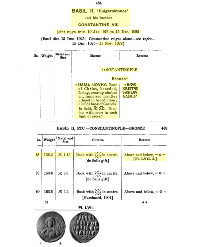 [ Translate ]Sources: Wikipedia (Basileus II [FR/EN]; Constantinus VIII [FR/EN]); IBC 38-40; DOC 3.2: A2.14.1-4, A2.22, A2.41.1-26; Réf. online: Google, acsearch, CGBFR, CoinArchives, FAC, WildWinds (text, image). Voir aussi ma fiche.
