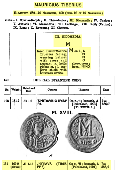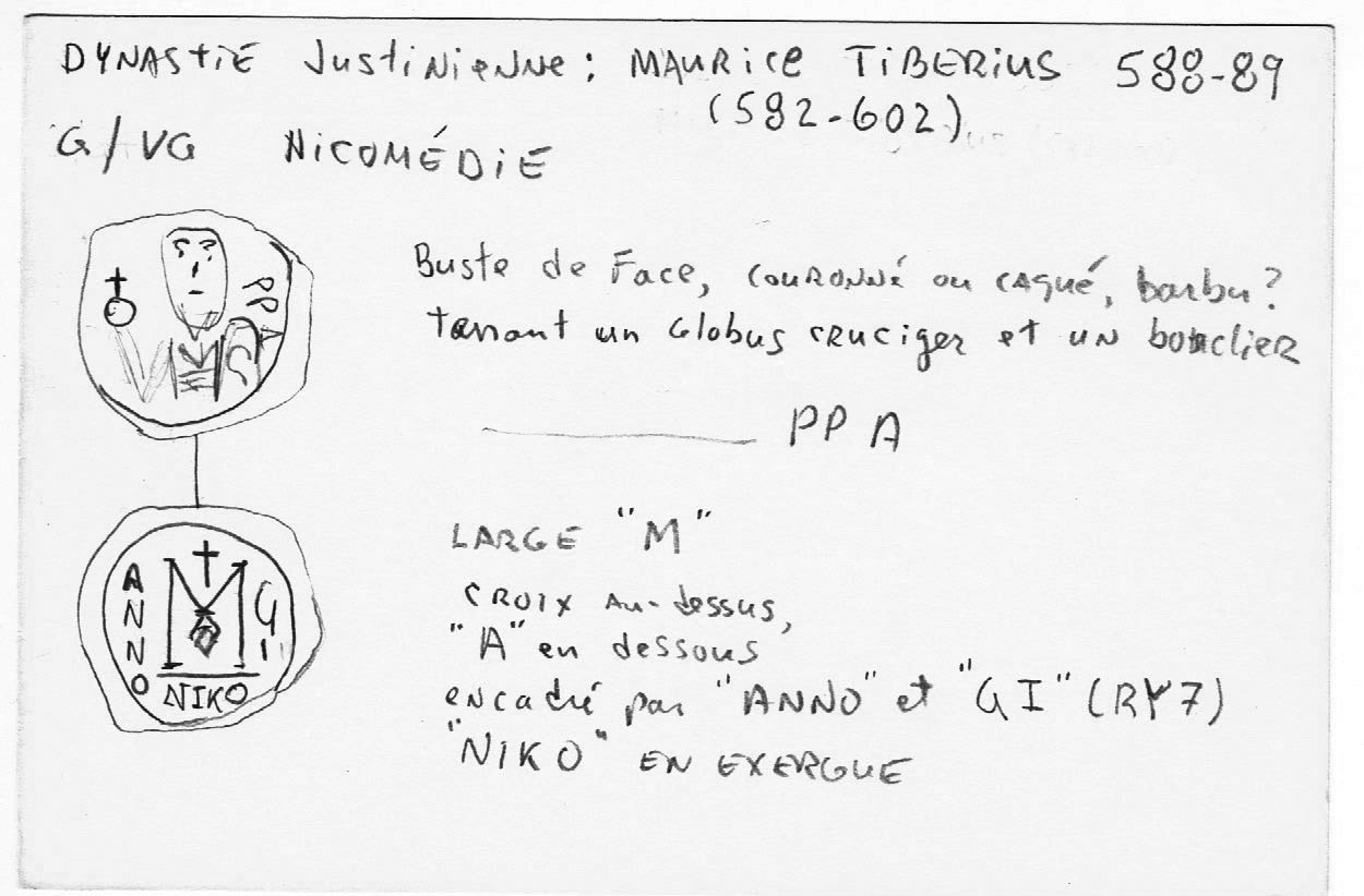 Sources: Wikipedia (Justinianus [FR/EN], Maurice Tiberius [FR/EN], globus cruciger, monnaie byzantine), FAC (Justinianus, Maurice Tiberius, Byzantine Denominations, globus cruciger, Nicomedia); IBC: 131, DOC 1: 97a; Réf. online pour Justinianus: acsearch, CoinArchives, CoinArchives, WildWinds (text, image); pour Maurice Tiberius: AkropolisCoins, WildWinds (text, image). Voir aussi ma fiche.