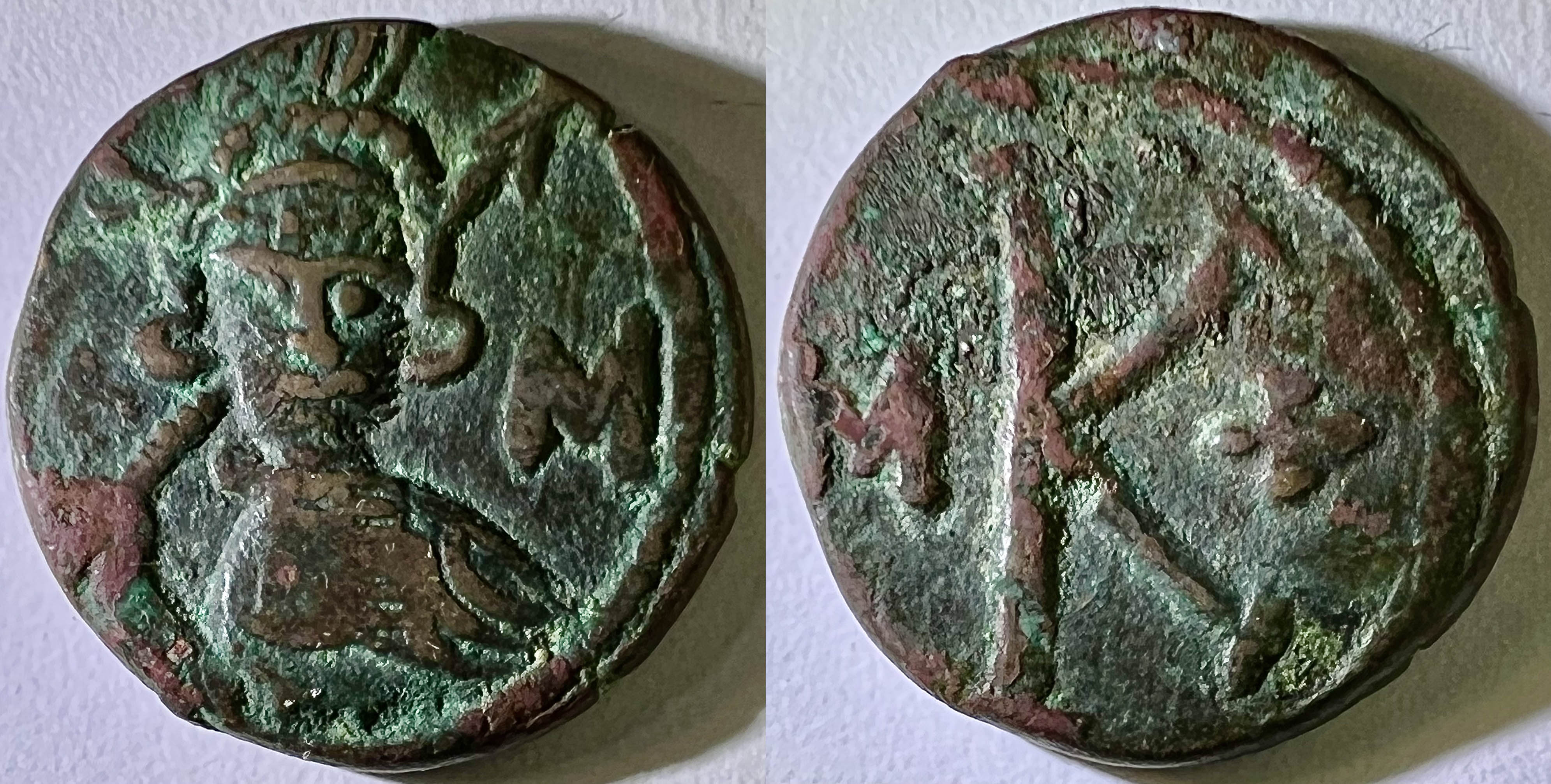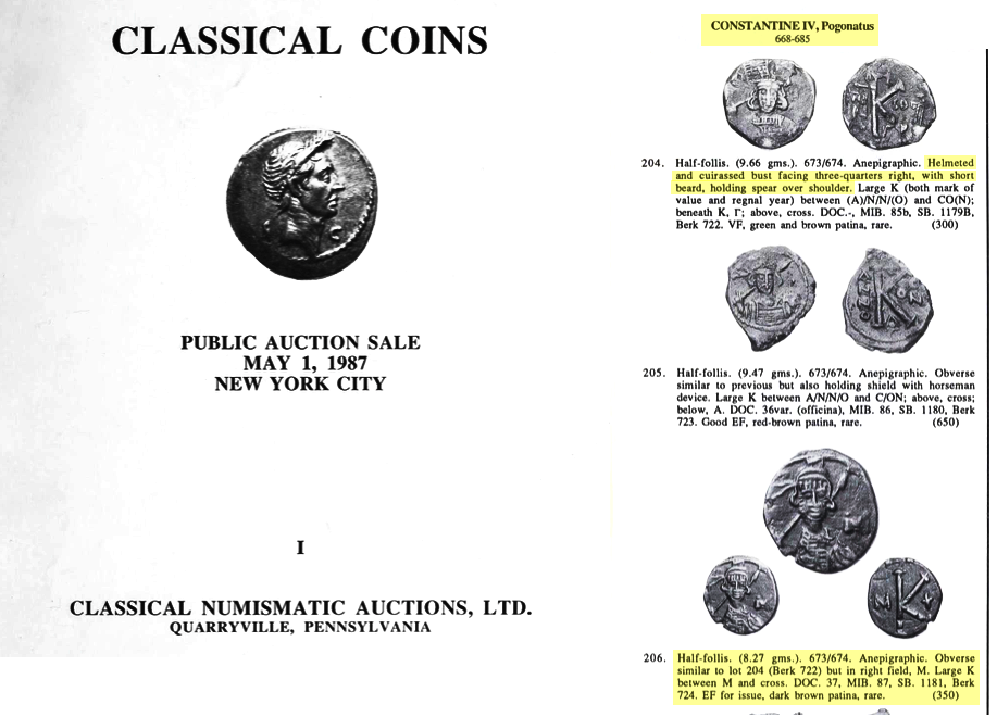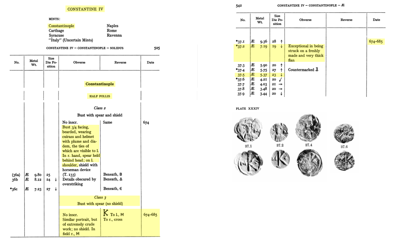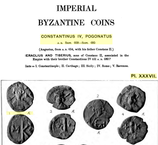 C’est de toute évidence un pièce qui date d’après la réforme d’Anastasius (où le revers ne comporte qu’une marque de valeur, soit M, K, I ou E). En recherchant longuement sur l’internet par images (sans grand succès) et par mots-clés, je n’ai finalement trouvé qu’une seule pièce qui correspondait à ces caractéristiques: un demi-follis de Constantinus IV. J’ai par la suite validé cette identification en consultant les ressources académiques (Hahn, W.  Moneta Imperii Byzantini. (Vienna, 1981): p. 259; Wroth, W. Catalogue of the Imperial Byzantine Coins in the BM, v. 2: p. 318; Bellinger, A.R. & P. Grierson, eds. Catalogue of the Byzantine Coins in the Dumbarton Oaks Collection and in the Whittemore Collection. (Washington D.C., 1966 – 1999). Vol. 2: Part 2:  Heraclius Constantine to Theodosius III: pp. 512, 514, 518-519, 541-542; et Classical Numismatic Auctions, 1987/05/01, #206).