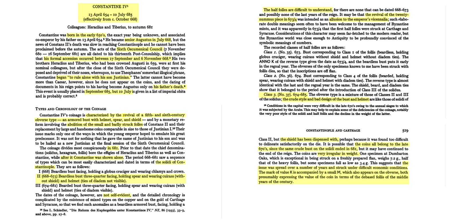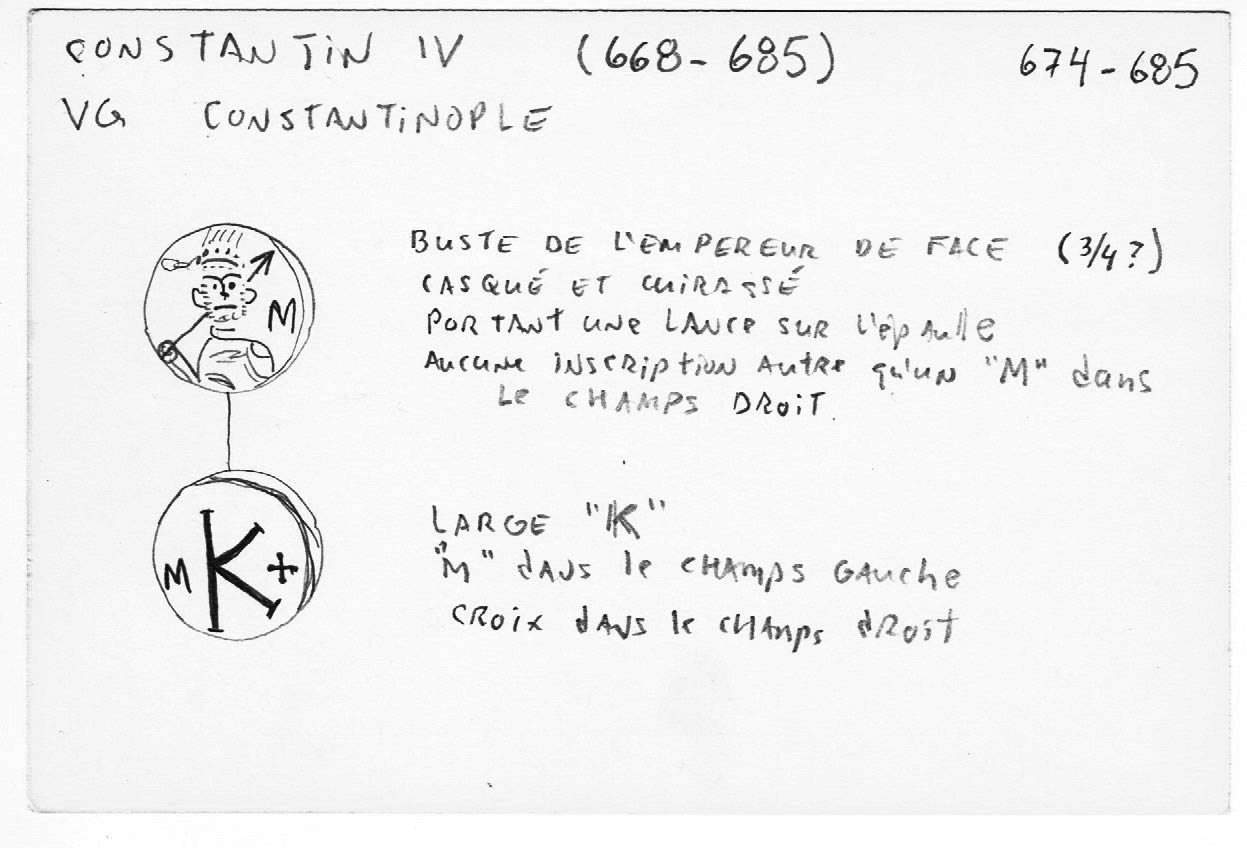 Sources: Wikipedia (Constantinus IV [FR/EN]); Doc (vol. 2, part 2): 37, Mib-87, S-BVC 1181, IBC: 33-38; Réf. online: Google, CoinArchives, vcoins. Voir aussi ma fiche.