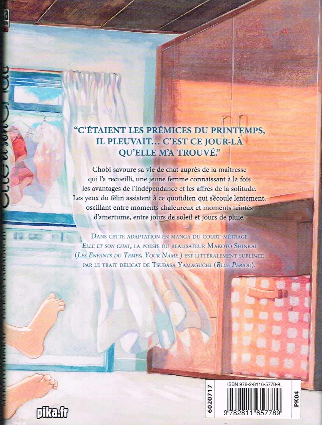 Elle et son chat par Makoto Shinkai (scénario) & Tsubasa Yamaguchi (dessin). Vanves: Pika Édition (Coll. Pika Seinen), septembre 2021. 164 pages, 13.3 x 18.1 cm, 7 € 50 / 12,95 $Can, ISBN 978-2-8116-5778-9. Pour un lectorat adolescent (13+).