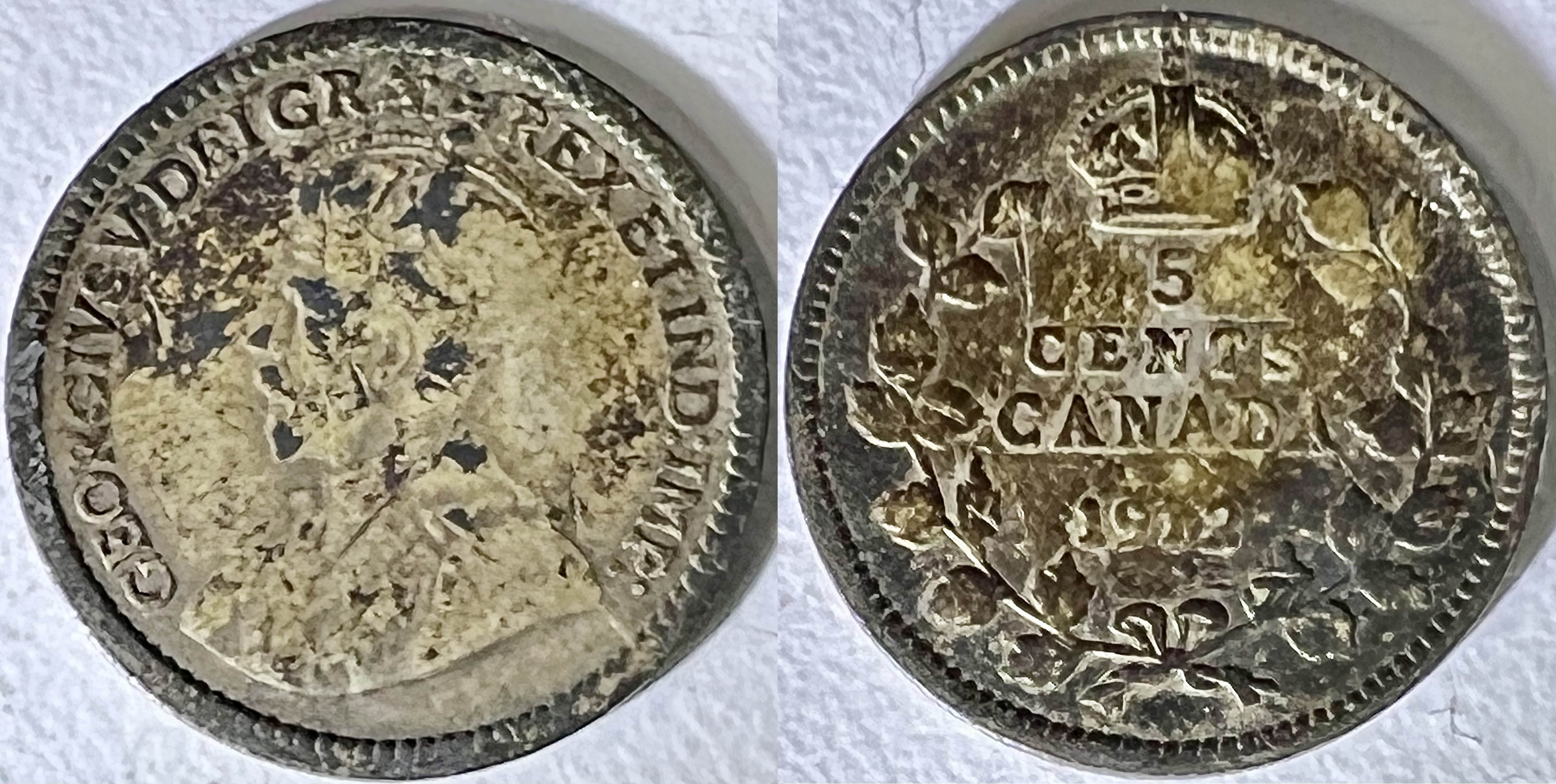 Mon cinq cents de 1912 est assez beau (G- [Good; argent très ternis, une concrétion obscurcie une bonne partie du portrait mais l’inscription demeure bien lisible], Ar [Argent; en fait 92.5% Ag et 7.5% Cu], 15.5 mm, 1.17 g, axe: ↑↑). L’avers présente un buste de George V à gauche, vêtu d’un manteau d’apparat et d’une couronne impériale, avec l’inscription latine GEORGIVS V DEI GRA: REX ET IND: IMP: (“George V, par la grâce de dieu, roi et empereur des Indes”). Le revers illustre deux branches d’érable croisées (onze feuilles de chaque côté), attachées à la base par un ruban et surmontées d’une couronne impériale entourant l’inscription anglaise (sur quatre lignes) 5 / CENTS / CANADA / 1912.