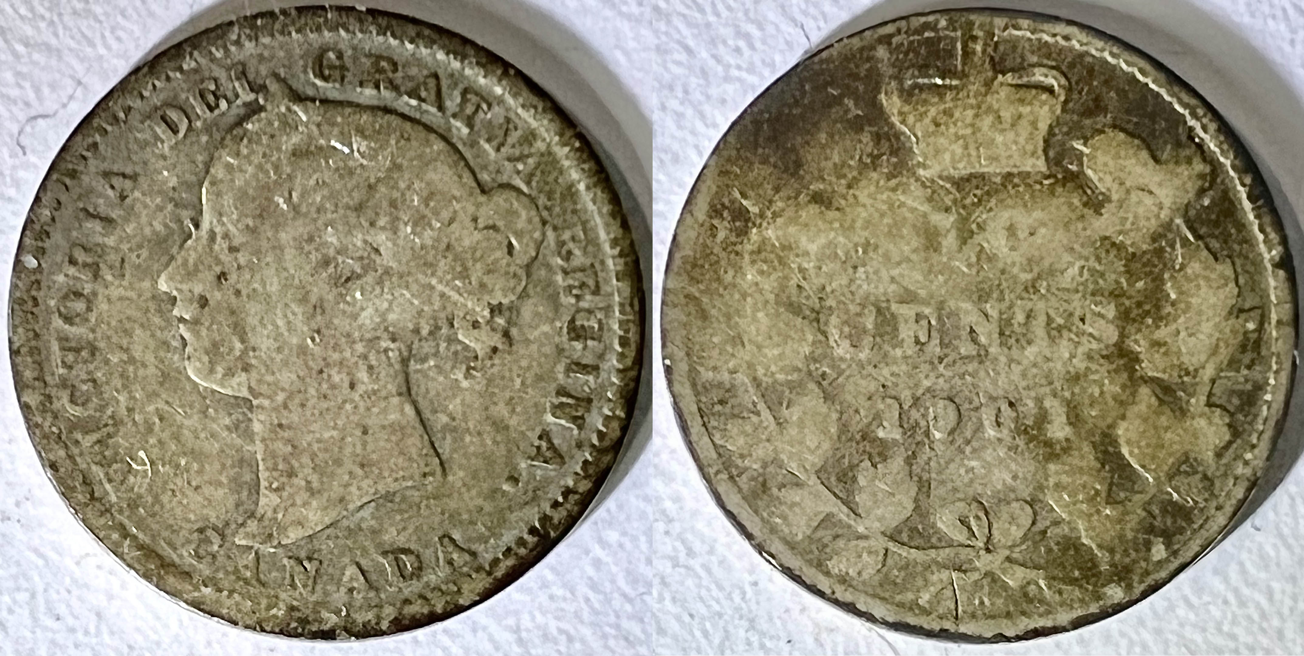 Ma plus ancienne pièce de dix cents date de la dernière année du règne de Victoria, soit 1901 (G [Good; un flan mince en argent ternis, le revers a connu beaucoup d’usure mais la dénomination et la date restent lisible], Ar [Argent; en fait 92.5% Ag et 7.5% Cu], 18 mm, 2.3 g, axe: ↑↓). Très similaire au cinq cents, l’avers présente une tête de Victoria (tournée) à gauche, coiffée d’une couronne de laurier et un chignon, avec l’inscription latine VICTORIA DEI GRACIA REGINA. (“Victoria, reine à la grâce de dieu” — on note le point terminal) et CANADA (en exergue). Le revers illustre deux branches d’érable croisées (onze feuilles de chaque côté), attachées à la base par un ruban et surmontées d’une couronne impériale entourant l’inscription anglaise (sur trois lignes) 10 / CENTS / 1901.