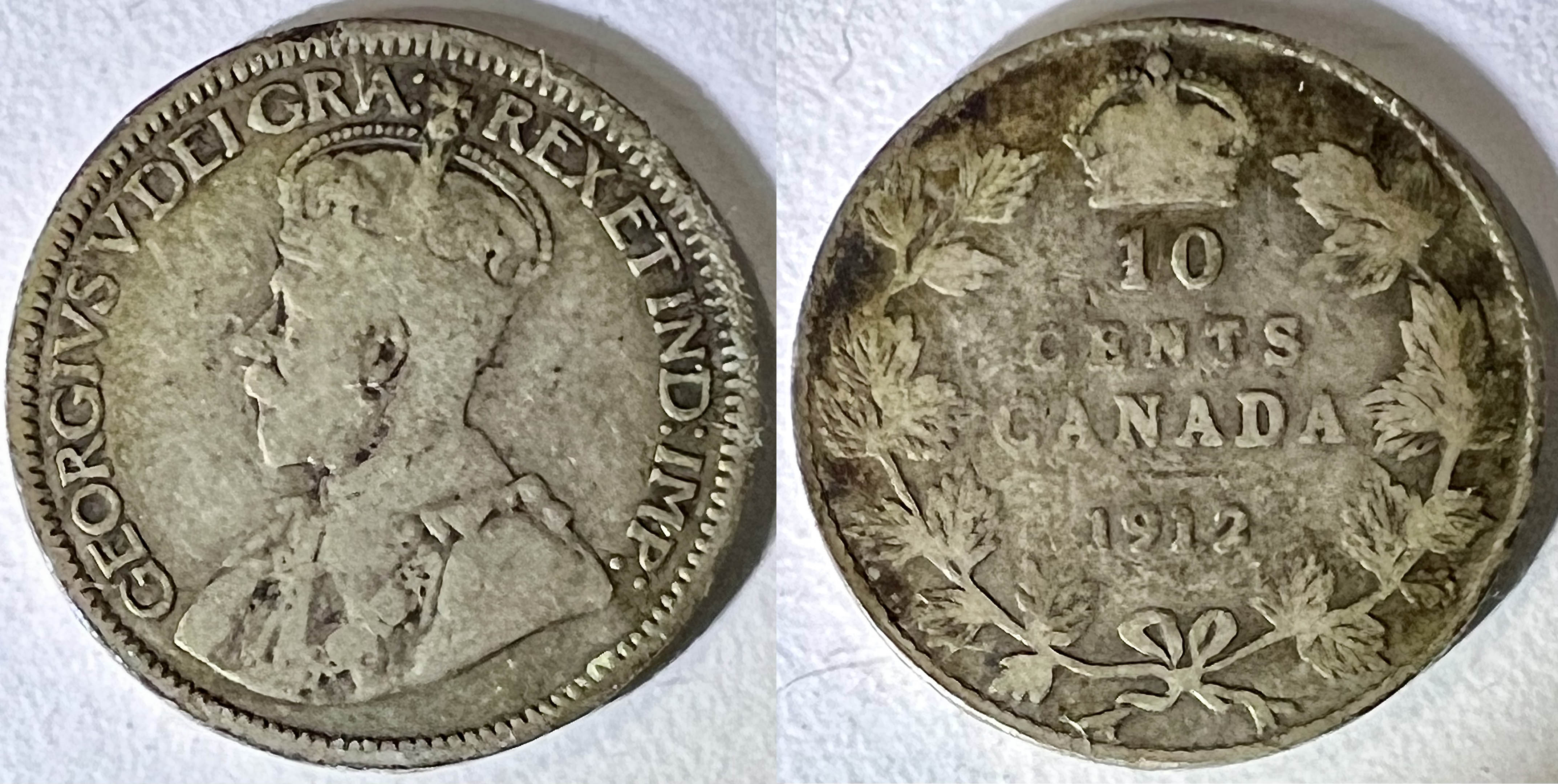 Mon dix cents de 1912 est assez beau (G+ [Good; argent ternis], Ar [Argent; en fait 92.5% Ag et 7.5% Cu], 18 mm, 2.3 g, axe: ↑↑). Encore une fois, très similaire au cinq cents, l’avers présente un buste de George V à gauche, vêtu d’un manteau d’apparat et d’une couronne impériale, avec l’inscription latine GEORGIVS V DEI GRA: REX ET IND: IMP: (“George V, par la grâce de dieu, roi et empereur des Indes”). Le revers illustre deux branches d’érable croisées (onze feuilles de chaque côté), attachées à la base par un ruban et surmontées d’une couronne impériale entourant l’inscription anglaise (sur quatre lignes) 10 / CENTS / CANADA / 1912.