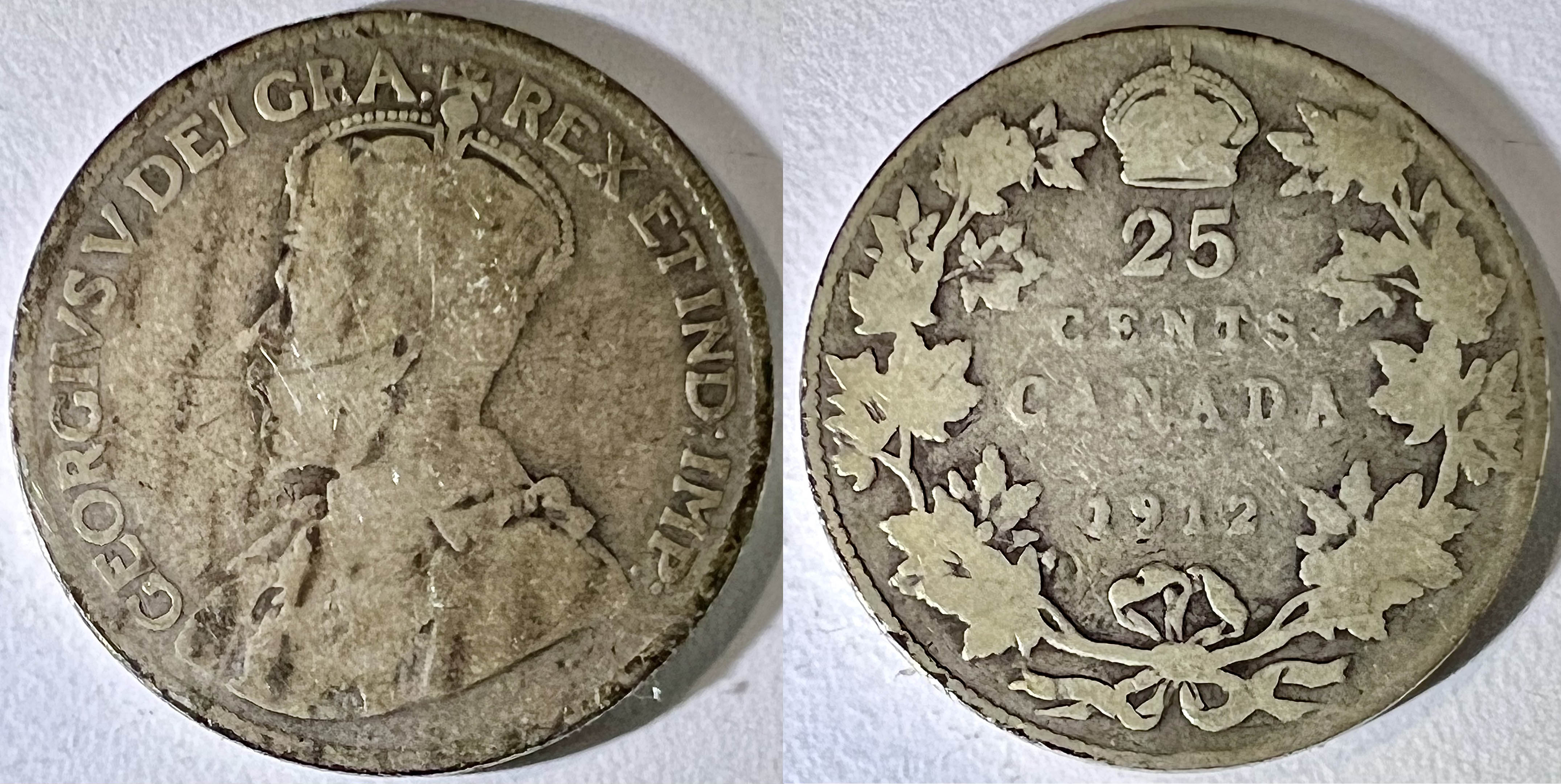 Ma pièce de vingt-cinq cents de 1912 est assez belle (G [Good; usure des reliefs], Ar [Argent; en fait 92.5% Ag et 7.5% Cu], 23.6 mm, 5.8 g, axe: ↑↑). L’avers présente un buste de George V à gauche, vêtu d’un manteau d’apparat et d’une couronne impériale, avec l’inscription latine GEORGIVS V DEI GRA: REX ET IND: IMP: (“George V, par la grâce de dieu, roi et empereur des Indes”). Le revers, redessiné par W.H.J. Blakemore, illustre deux branches d’érable croisées (onze feuilles de chaque côté), attachées à la base par un ruban et surmontées d’une couronne impériale (légèrement plus grande) entourant l’inscription anglaise (sur quatre lignes) 25 / CENTS / CANADA / 1912.