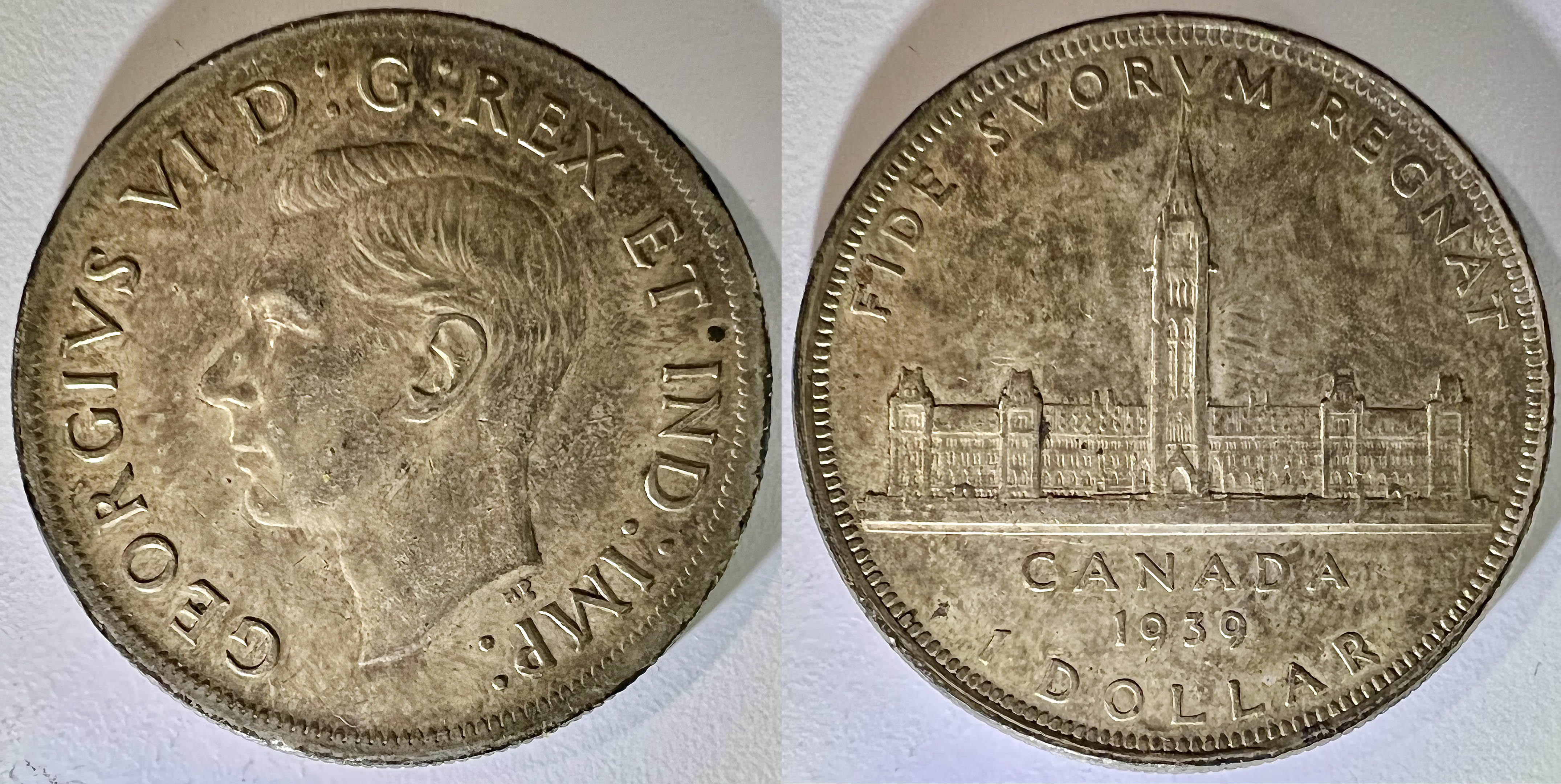 Mon exemplaire le plus ancien est une belle pièce de 1939 (VG [Very Good], Ar [Argent; un titrage de 80% Ag et 20% Cu], 36 mm (épaisseur de 2.84 mm), 23.3 g, axe: ↑↑). L’avers (conçu par T.H. Paget) présente une tête nue de George VI, à gauche, avec l’inscription latine GEORGIVS VI D: G: REX ET IND: IMP: (“George VI, par la grâce de dieu, roi et empereur des Indes“). Le revers (conçu par Emanuel Hahn) illustre la partie centrale de l’édifice parlementaire à Ottawa avec, au-dessus, l’inscription latine FIDE SVORVM REGINAT (“Il règne par la foi [de son peuple]”) et, au-dessous (sur trois lignes), CANADA / 1939 / 1 DOLLAR. Cette pièce commémore la visite royale de George VI et de la reine consort Elizabeth en 1939. Elle était disponible par commande à la Banque du Canada et dans les bureaux de poste mais elle a été produite en tellement d’exemplaires (1.36 million) que plus de cent-cinquante mille d’entre eux durent être refondue entre 1939 et 1945…