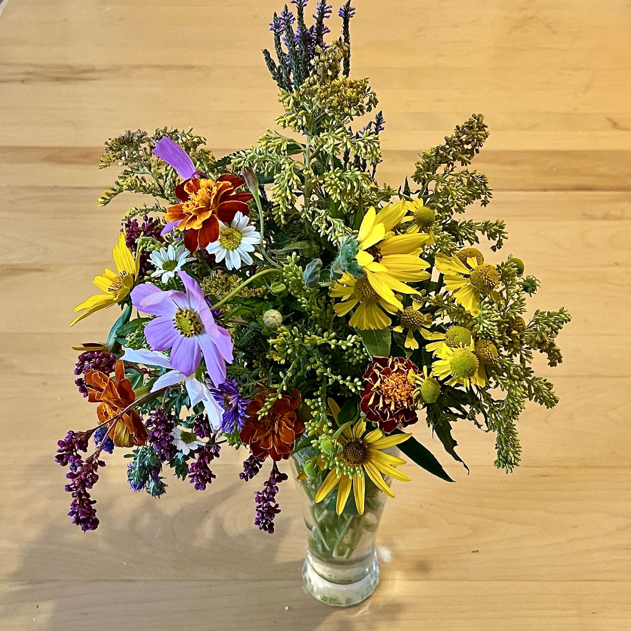 Un beau bouquet avec les dernières fleurs de la saison. Si vous avez porté attention à mon blog ces derniers mois vous devriez pouvoir identifier toutes ces fleurs…