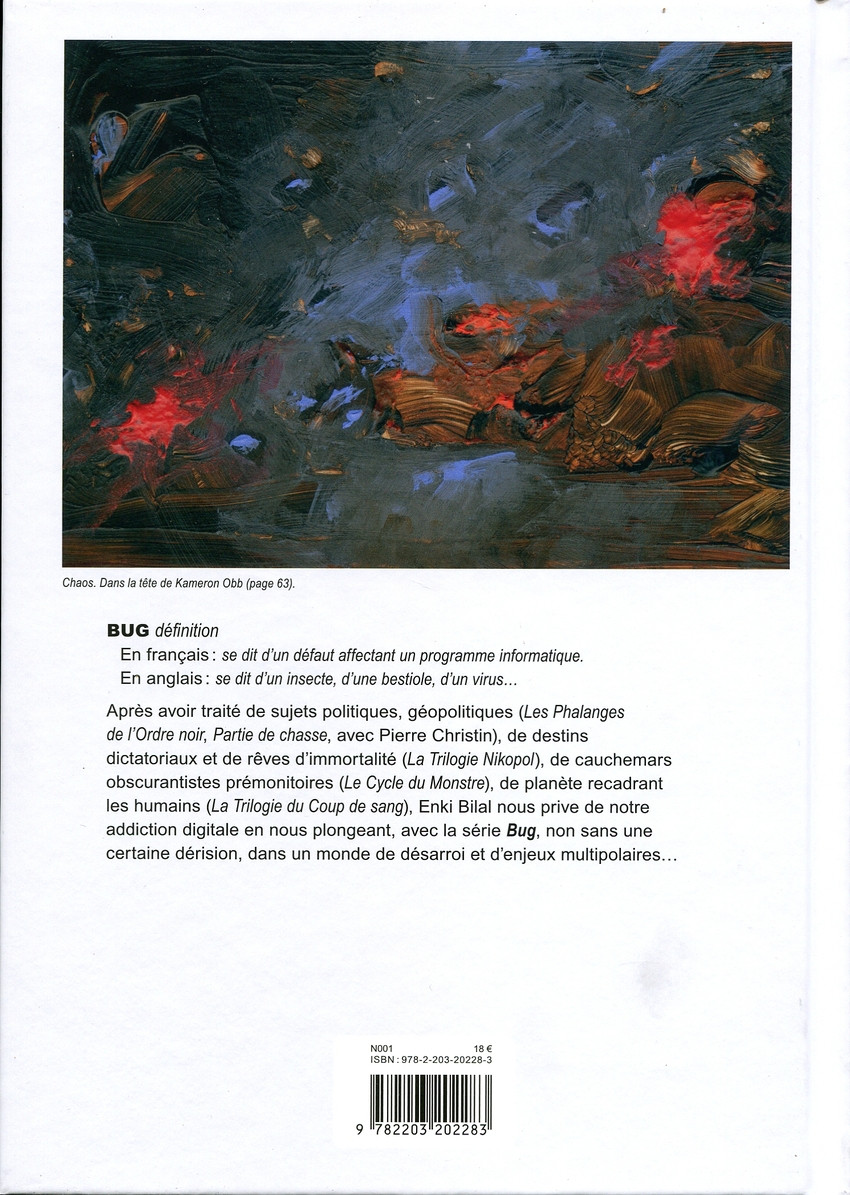 Bug, livre 3, par Enki Bilal. Bruxelles: Casterman, mars 2022. 82 pages, 19.1 x 26.9 cm, 18,00 € (ePub/PDF: 12,99 €) / $34.60 Can. ISBN 978-2-203-20228-3. Pour lectorat jeune adulte (14+).