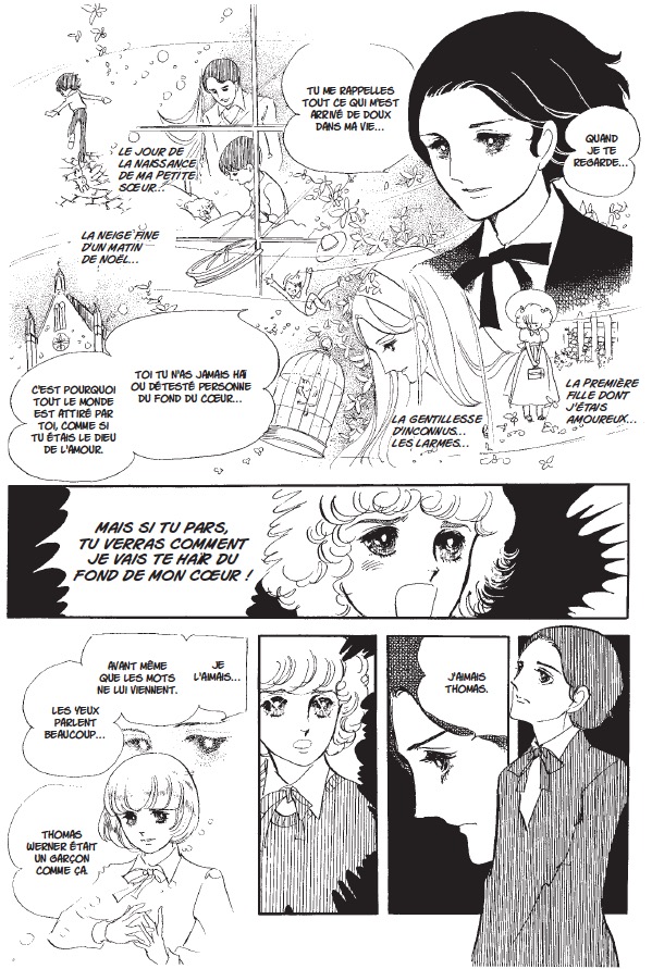 Le coeur de Thomas est donc un drame psychologique qui, comme la plupart des oeuvres de Moto Hagio, nous présente des enfants qui sont les membres les plus vulnérables de la société [9] et auxquelles elle ne craint pas d’associer les émotions sexuelles et violentes de l’adolescence [10]. Il est rare de trouver dans un manga du milieu des années 1970 autant de complexité et de profondeur: au milieu de connotations religieuses on retrouve des sujets comme la famille dysfonctionnelle, les amours interdits, la réjection amoureuse, le suicide, le traumatisme causé par l’intimidation (voir même la torture et un viol collectif), le tout enveloppé dans les affres psychologiques propres à l’adolescence. Et si le style de dessin pourrait paraître un peu vieillot à certains, il représente le summum du style shōjo, avec ses traits fins et précis, ses textures et fioritures, son montage éclaté, qui soutient superbement la complexité du récit.