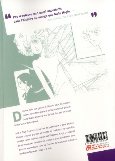 Écrit au début des années 70 par l’une des pionnières de la bande dessinée féminine, ce roman graphique sur les affres de l’adolescence est aujourd’hui considéré comme une étape majeure dans l’histoire du manga. La complexité de ses personnages, l’inventivité de sa mise en scène et la féminité revendiquée de son graphisme en on fait l’une des plus marquantes explorations visuelles des liens entre l’amour et la mort.”