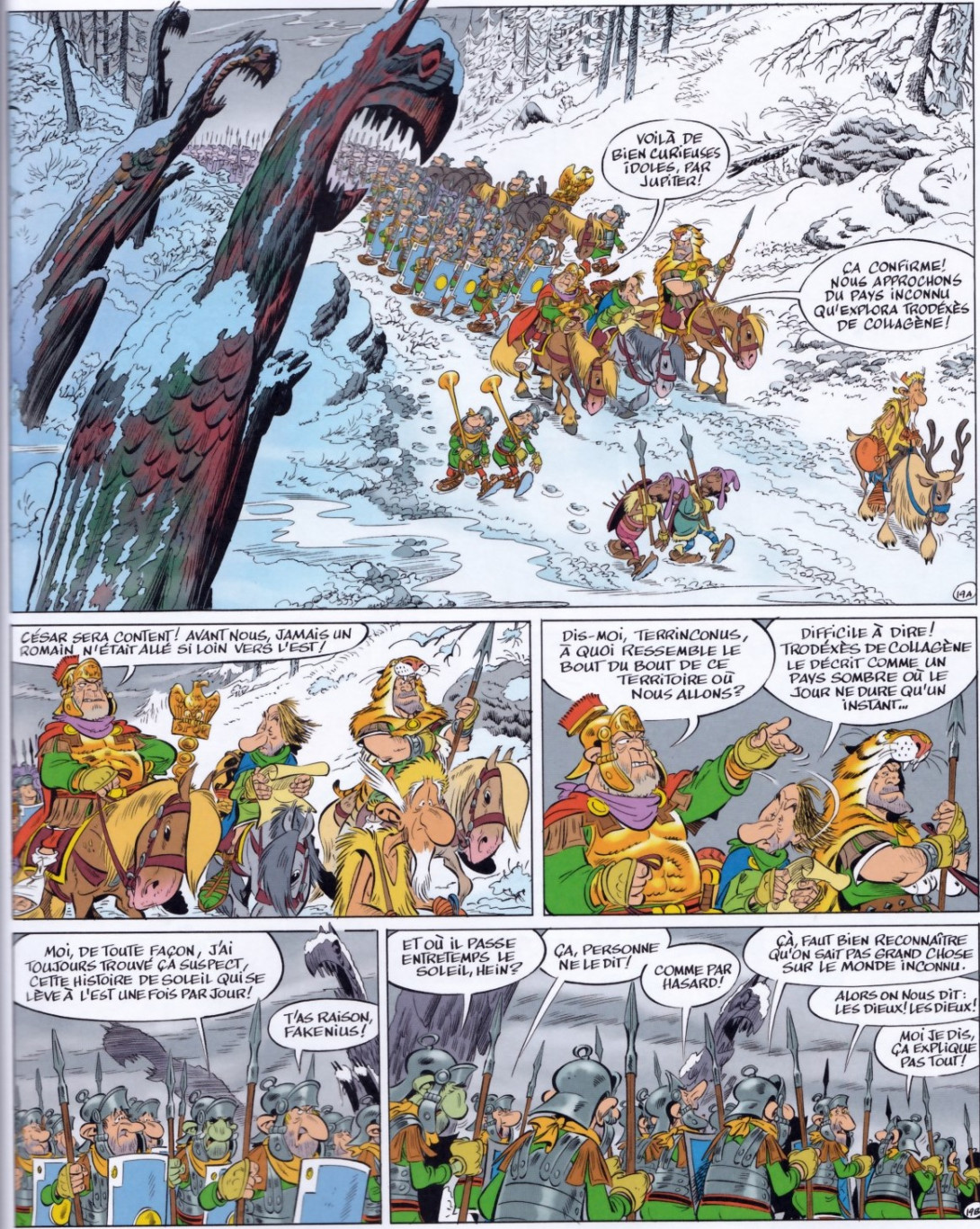 “Un totem de Griffon planté dans un paysage enneigé, sauvage et apparemment désertique, Astérix aux aguets sur son cheval affichant lui-même un regard inquiet, Idéfix dans tous ses états, appelé par un Obélix troublé… Par Toutatis, où sont donc nos héros ?!?
