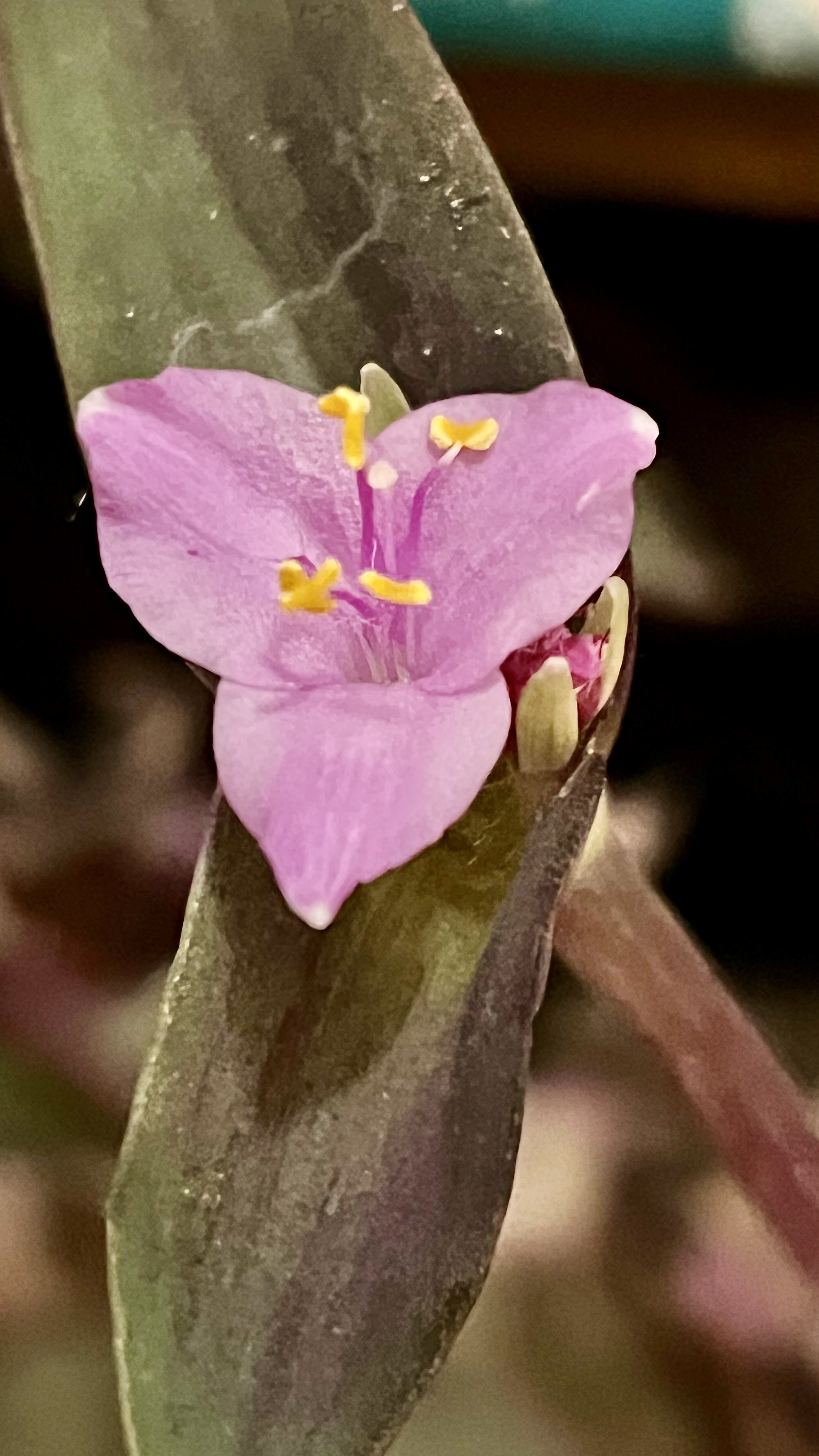 Originaire du Mexique, elle est caractérisée par des feuilles engainantes étroites et pointues (de cinq à douze centimètres de long) et des fleurs à trois pétales (d’un diamètre de deux centimètres et demi). Les fleurs sont censées être éphémères (ne florissant qu’une seule journée) mais la mienne a fleuri plusieurs jours (toutefois, après l’avoir ramassée sur le bord de la route il y a presqu’une décennie, c’est la première fois cet hiver qu’elle fleurit !). Elle est très appréciée comme plante d’intérieure à cause de son feuillage décoratif qui devient pourpre lorsqu’exposé au soleil ou passe au vert si on la garde dans un espace ombragé. C’est également une plante qui se bouture facilement et qui résiste bien aux contraintes (par contre elle ne supporte pas le gel).