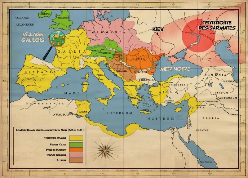 Promesse d’aventure aux confins du Monde Connu, au pays des Sarmates, l’illustration de la couverture laisse augurer d’un Western transposé dans le grand froid… Didier Conrad, auteur du dessin, nous en dit plus : « C’est un Eastern ! Vous retrouverez dans l’album tous les codes classiques du Western : de grands espaces, des héros venus de loin aider des innocents, des « sauvages » qui subissent l’arrivée conquérante d’une armée… mais à l’Est ! »”