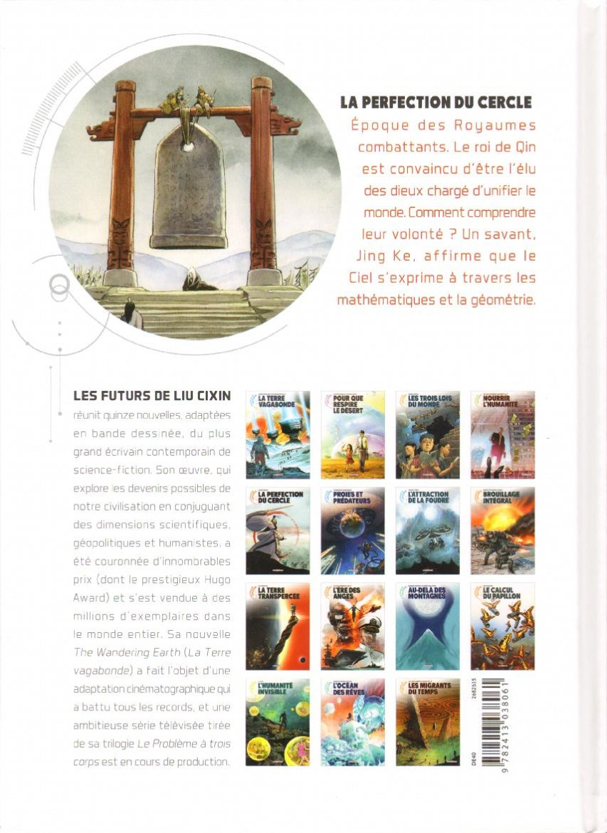 La Perfection du Cercle (Les Futurs de Liu Cixin, #5), par Xavier Besse (d’après une nouvelle de Liu Cixin). Paris: Delcourt (Coll. Néopolis), août 2022. 74 pages, 21.8 x 30 cm, 17.95 € / $29.95 Can, ISBN 978-2-413-03806-1. Pour un lectorat adolescent (12+).