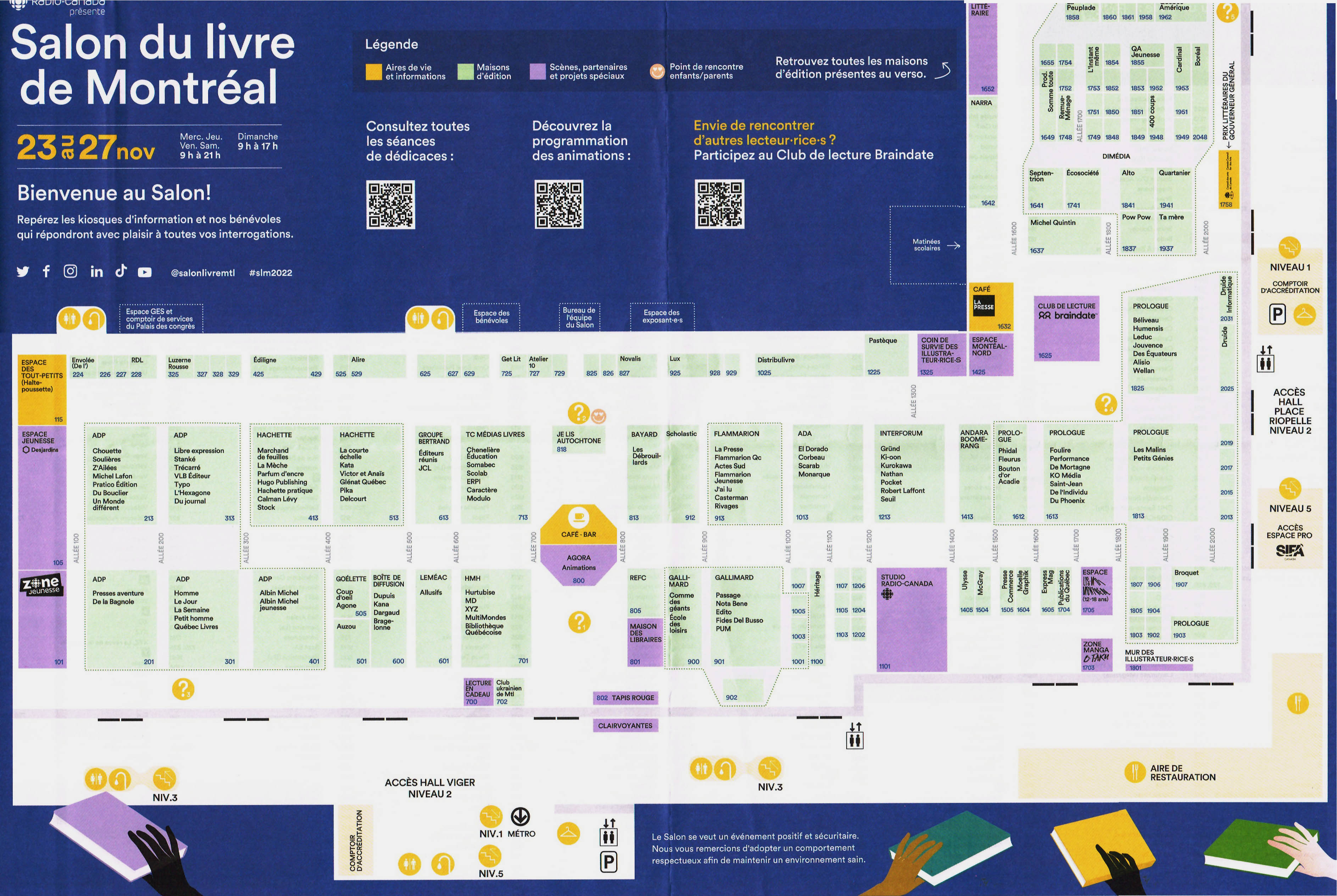 C’est la seconde année que le salon se tient au Palais des Congrès. Le bon vieux salon de la Place Bonaventure me manque un peu mais c’est surtout que j’avais une vieille habitude de parcourir le salon dans tous les sens pour ne rien manquer (dans le sens du cardo et du decumanus selon la centuriation de l’urbanisme romain) et que je trouve une configuration différente (en forme de “L” — comme dans littérature) un peu désorientante. Mais, bon, je vais m’y habituer. Il suffit de parcourir le salon par section. Au moins le salon cette année est un peu plus grand que le précédent (qui avait souffert des suite de la COVID-19).