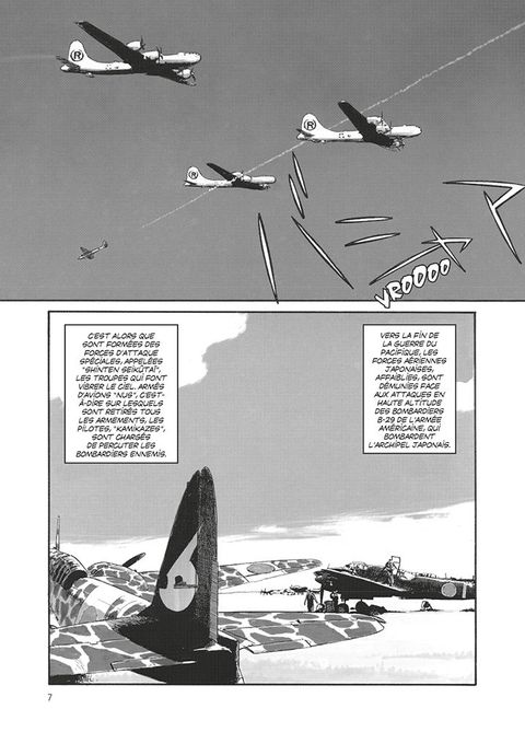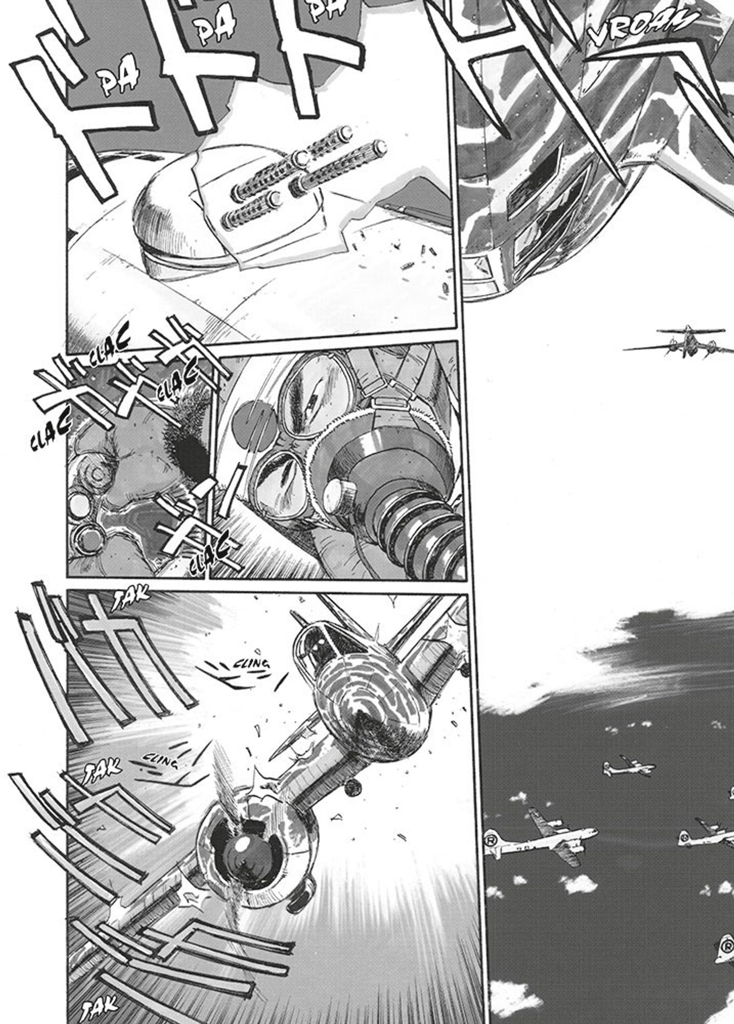 Dans “Ces hommes qui ont fait trembler le ciel” (『震天制空隊』/ Shinten Seikūtai / lit. “Corps de l’air séisme”; 24 pages) les pilotes japonais ont de la difficulté à abattre les bombardiers B-29 américains qui ont des capacités bien supérieures aux avions de combat de l’armée japonaise. L’utilisation de jeunes pilotes suicides dans des Kawasaki KI-45 “Tueur de dragon” n’est pas une solution viable…