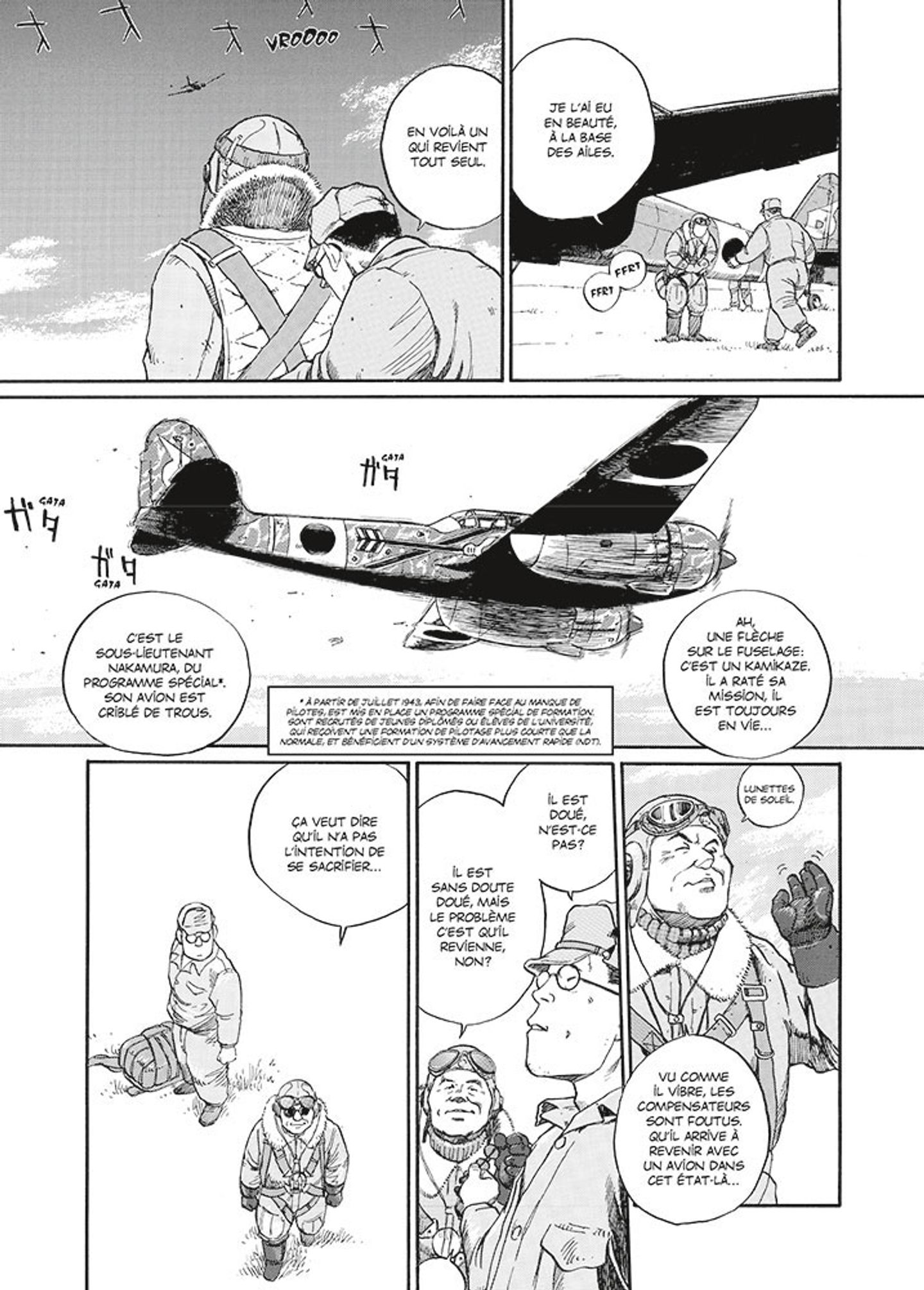 “1944 et 1945. Fin de la seconde guerre mondiale sur le front pacifique. Le Japon résiste à l’armée américaine grâce à l’engagement jusqu’à la mort de ses pilotes. Par de courts récits forts et graphiquement irréprochables, Seiho Takizawa illustre le combat d’une armée en déroute.”
