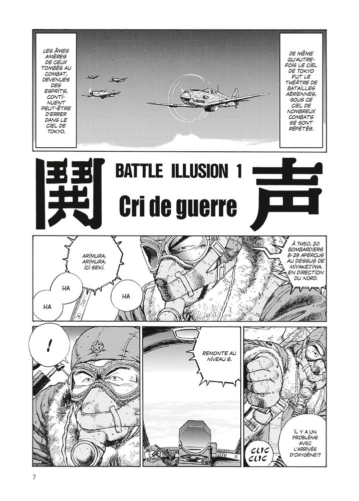 “Battle Illusion I: Cris de guerre” (「鬨声」 / Kachidoki-goe; 8 pages): un pilote imagine son duel aérien comme un combat de samuraï.