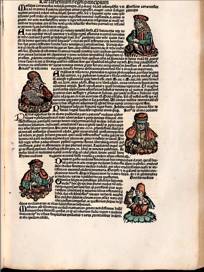 Le recto du feuillet CCXXIIII comporte un titre en entête (“Anfang der Carrarier herrschung” / “Origine du règne des seigneurs de Carrare”), cinq illustrations et six vignettes consacrées à Marsiglio (Marsilius) de Carrara (seigneur de Padoue), Arnaldus de Novavilla (Arnaud de Villeneuve, médecin et théologien valencien), Petrus Apponus (Pietro d’Abano, médecin et philosophe de Padoue), Dino Del Garbo (médecin florentin), Gentilis Fulginas (Gentile da Foligno, médecin et philosophe de la ville de Foligno) et Matheus Silvaticus (Matthieu Silvaticus, médecin et botaniste de Mantoue). Voir la traduction anglaise du recto.