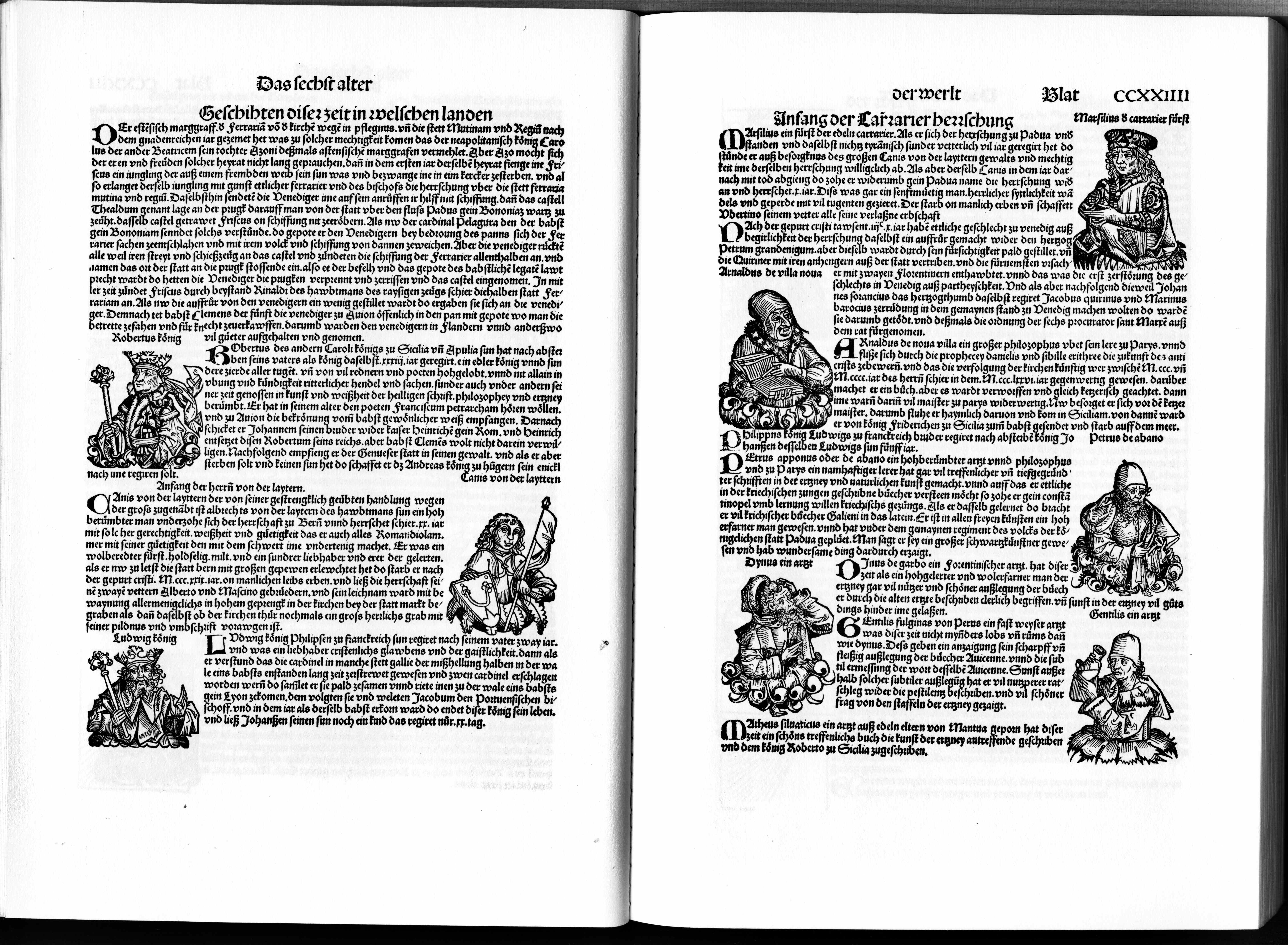 L’aspect le plus remarquable de cet ouvrage est le fait que c’est le premier livre imprimé (et sans doute le seul de son époque) à comporter un nombre aussi important d’illustrations. L’impression de ce livre a nécessité l’utilisation d’un double procédé: la presse typographique pour le texte et des panneaux de gravure sur bois pour les illustrations. Pour produire celles-ci, l’imprimeur a fait appel à l’atelier local de Michael Wolgemut et de Wilhelm Pleydenwurff (auquel a brièvement travaillé le jeune Albrecht Dürer). La plupart représentent des villes ou des personnages importants mais on retrouve également deux cartes géographiques (l’une représentant le monde selon la second projection de Ptolémée et l’autre l’Allemagne). L’ouvrage contient ainsi près de trois mille illustrations mais comme un millier d’entre elles sont des répétitions (la même image étant utilisée pour illustrer différentes villes ou personnages) il n’y a en fait que mille huit cent neuf illustrations uniques ayant nécessité la création de six cent quarante cinq gravures sur bois. Certains ouvrages contiennent des illustrations qui ont été par la suite rehaussée à la main de couleurs à l’aquarelle.
