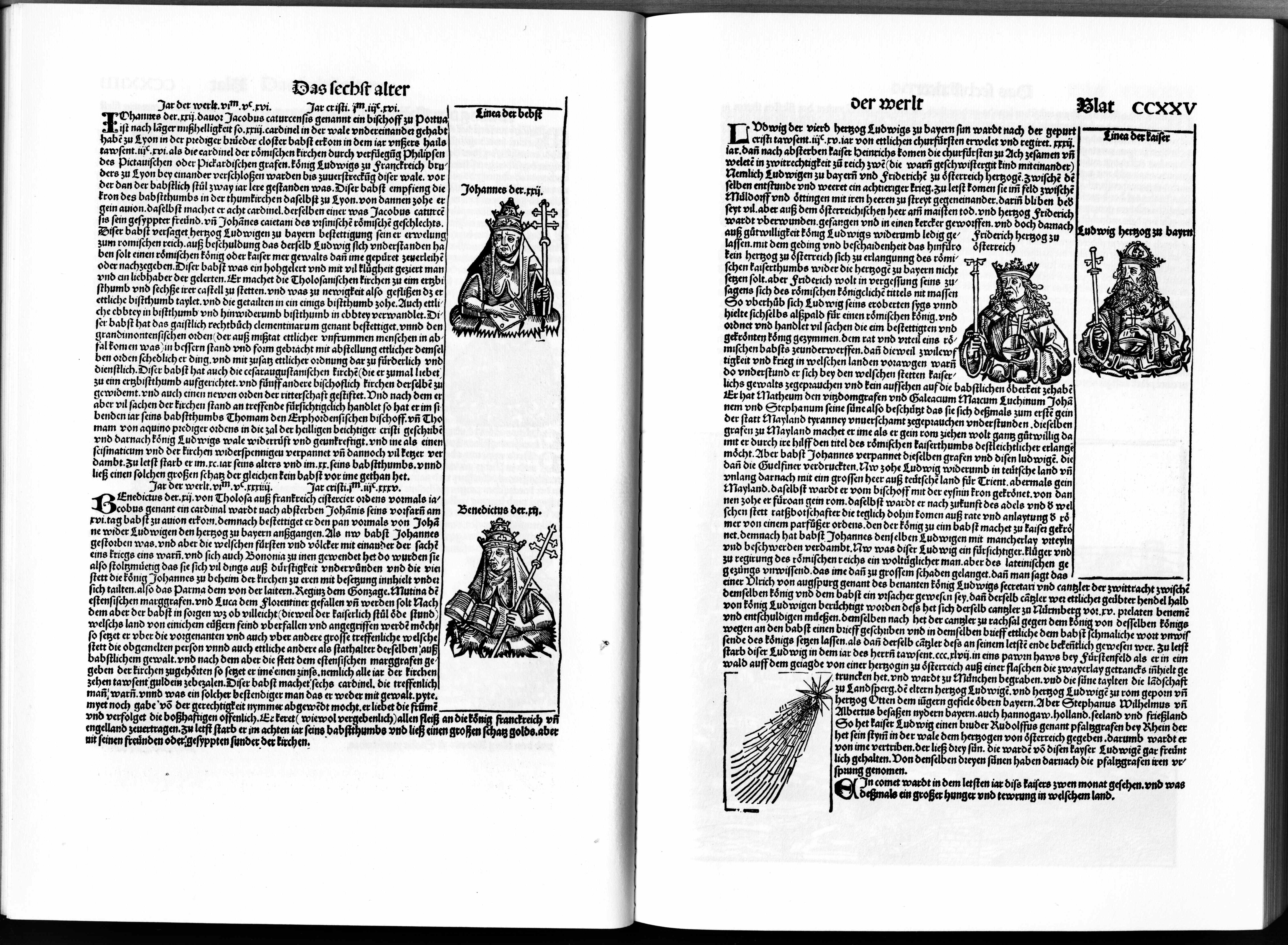 Comme les tout premiers livres imprimés ne comportaient pas de page titre, le nom de “Chronique de Nuremberg” lui a été attribué ultérieurement par les spécialistes puisque c’est une “chronique” publiée à “Nuremberg”. Il s’agit d’une chronique universelle qui se veut raconter l’histoire du monde en se basant sur la Bible (et quelques autres sources anciennes et médiévales) et y ajoutant, de façon encyclopédique, des vignettes sur les villes et les personnages importants de l’époque traitée (rois, membres du clergé, penseurs et philosophes). L’ouvrage a connu deux éditions, toutes deux imprimées à Nuremberg par Anton Koberger en 1493. Il a d’abord été écrit en latin par Hartmann Schedel sur une commande des marchands Sebald Schreyer et Sebastian Kammermeister, puis il a ensuite été traduit en allemand par George Alt. L’édition latine, le Liber chronicarum, a été publié en juillet 1493 à environ 1500 exemplaires (dont il ne subsiste que quatre cent) et l’édition allemande, Das buch der Chroniken vnnd geschichten mit figuren vld pildnussen von Anbeginn der welt biss auff dise vnsere Zeyt [“Le livre des chroniques et histoires avec figures et illustrations depuis le commencement du monde jusqu’à nos jours”] ou simplement Die Schedelsche Weltchronik [“Chronique universelle de Schedel”], a été publiée en décembre 1493 à environ mille exemplaires (dont il ne subsiste que trois cent). C’est l’incunable le mieux conservé et le plus étudié (le plus connu et le plus ancien étant La Bible de Gutenberg publiée en 1454).