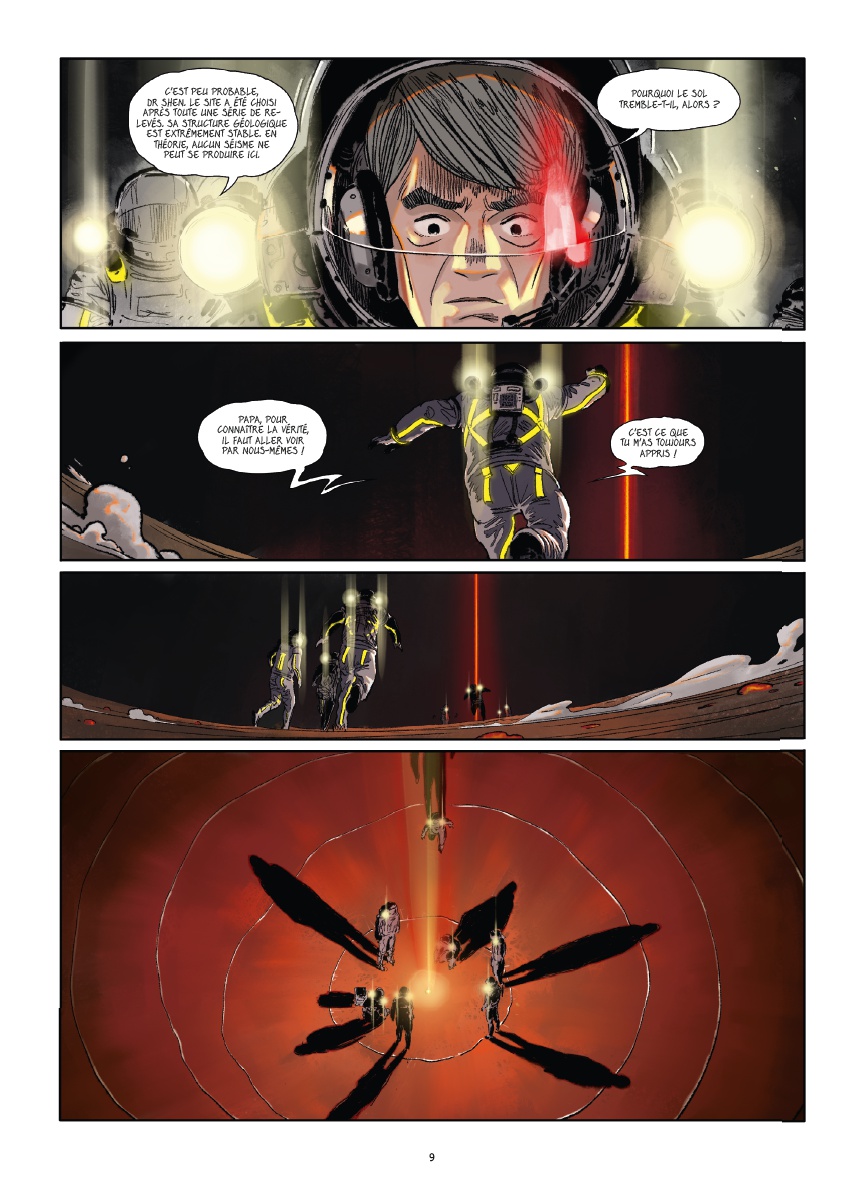 La Terre Transpercée (Les Futurs de Liu Cixin, #9), par Wu Qingsong (Scénario d’après une nouvelle de Liu Cixin). Paris: Delcourt (Coll. Néopolis), février 2023. 93 pages, 21.5 x 29.8 cm, 21.90 € / $36.95 Can, ISBN 978-2-413-03807-8. Pour un lectorat adolescent (12+).