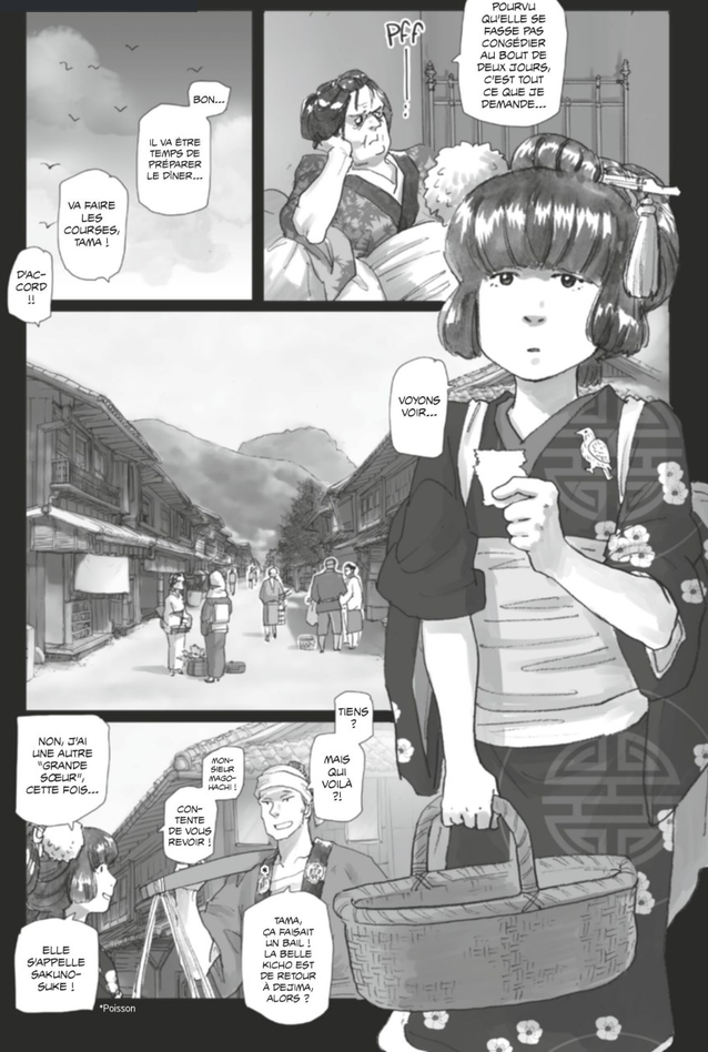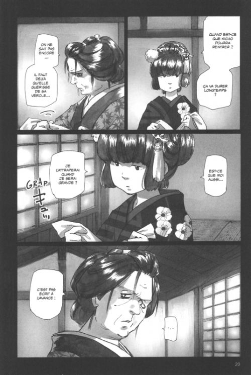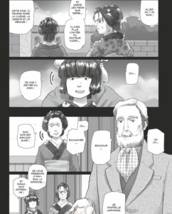 Comme pour les volumes précédents de la série, ce manga nous fait découvrir au travers de son récit les particularités de cette intéressante époque de transition dans l’histoire du Japon, en s’attardant surtout sur l’univers des courtisanes et la relation que le Japon de l’époque entretenait avec les étrangers. Cet aspect didactique est accentué par des capsules informatives (cette fois appelées “Boîte à secrets de Dejima”) où l’auteur explique le contexte historique des lieux, des événements ou personnages rencontrés dans le récit. Au début je trouvais le style graphique de Takahama un peu brouillon et déplaisant mais on s’y habitue et elle s’est beaucoup améliorée avec le temps. Elle utilise beaucoup de trames et de ton de gris ce qui donne beaucoup de dimension et d’originalité à son dessin. Somme toute, ce manga nous offre un beau récit à la fois informatif et divertissant. C’est donc une très bonne et agréable lecture. J’ai bien hâte de lire la suite…