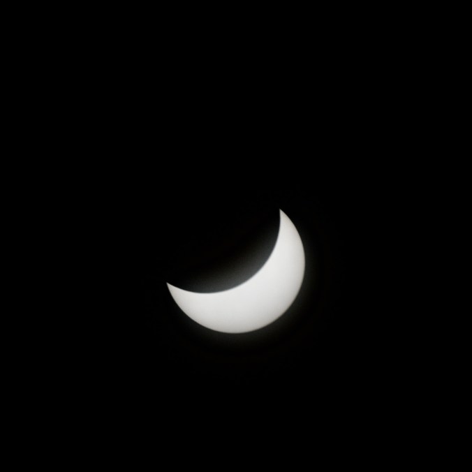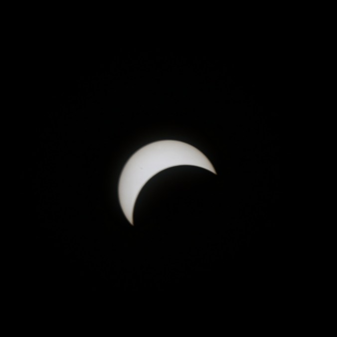 Voici le résultat de ma tentative de photographier l’éclipse solaire totale du 8 avril 2024. J’ai utilisé ma Nikon D3300 réglé en ISO 400. J’ai eu beaucoup de difficulté au début à cadrer le soleil dans l’objectif puis à trouver les meilleurs paramètres. Les photographies sont prises à interval d’environ cinq minutes. Pour la première image, j’ai utilisé un objectif Tamron 300 mm f5.6 avec un filtre ND 1000. Comme le filtre était insuffisant, j’ai dû utiliser une vitesse d’obturation plus haute (1/3200 seconde). Toutes les autres images utilisent un objectif Optera 500 mm f6.3 avec un filtre plus opaque Nano-K ND1000000. J’ai varié la vitesse d’obturation (entre 1/80 s et 1/15 s) en fonction du niveau de luminosité du croissant solaire, mais les photos prises à basse vitesse sont un peu plus floues à cause du mouvement inévitable de la caméra malgré le trépied. Sur les deux premières images prises avec l’Optera, on remarque deux petites taches solaires. J’ai manqué le moment de totalité, car, étant légèrement en dehors de la zone de totalité, ce moment a été très bref et il aurait fallu que j’enlève le filtre de l’objectif pour le capturer et je n’ai pas eu le temps de le faire. Je suis tout de même assez satisfait du résultat.