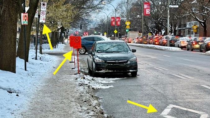Combien d’interdictions que ça prend pour empêcher quelqu’un de se stationner ?! Y’a plus d’respect ! Ni pour la loi ni pour autrui… Le tissu social se désagrège… Que nous réserve l’avenir ? • How many signs does it take to stop someone from parking there?! People have only contempt for the law or their fellow citizen… The social fabric is disintegrating… What does the future hold for us?