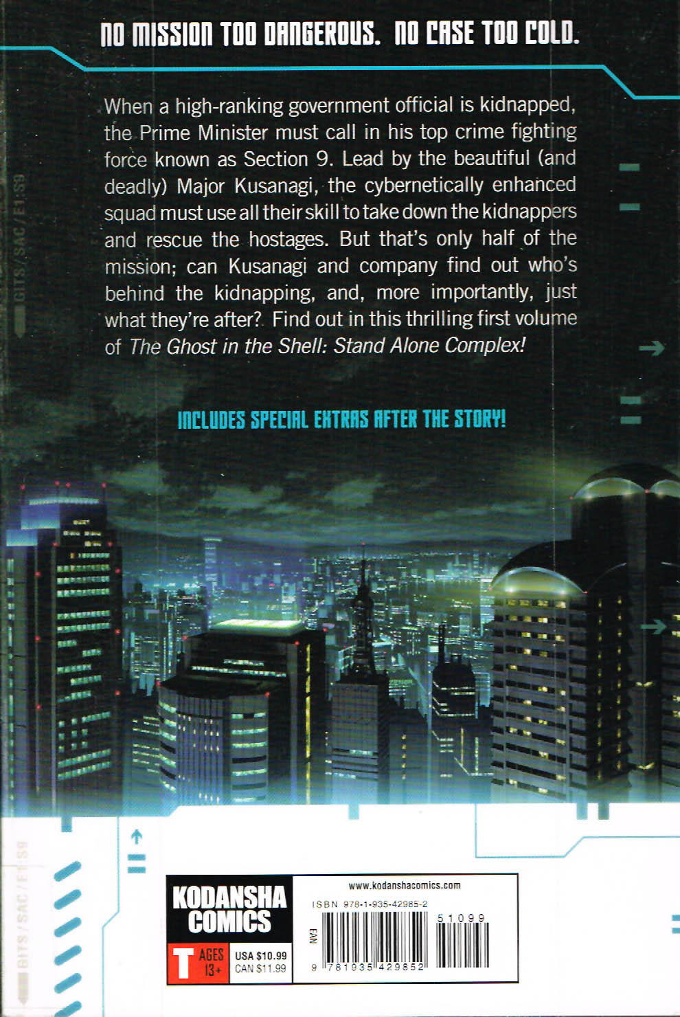 “Volume 1: No mission too dangerous. No case too cold. When a high-ranking government official is kidnapped, the Prime Minister must call in his top crime fighting force known as Section 9. Led by the beautiful (and deadly) Major Kusanagi, the cybernetically enhanced squad must use all their skill to take down the kidnappers and rescue the hostages. But that’s only half of the mission; can Kusanagi and company find out who’s behind the kidnapping, and, more importantly, just what they’re after? Find out in this thrilling first volume of The Ghost in the Shell: Stand Alone Complex!”