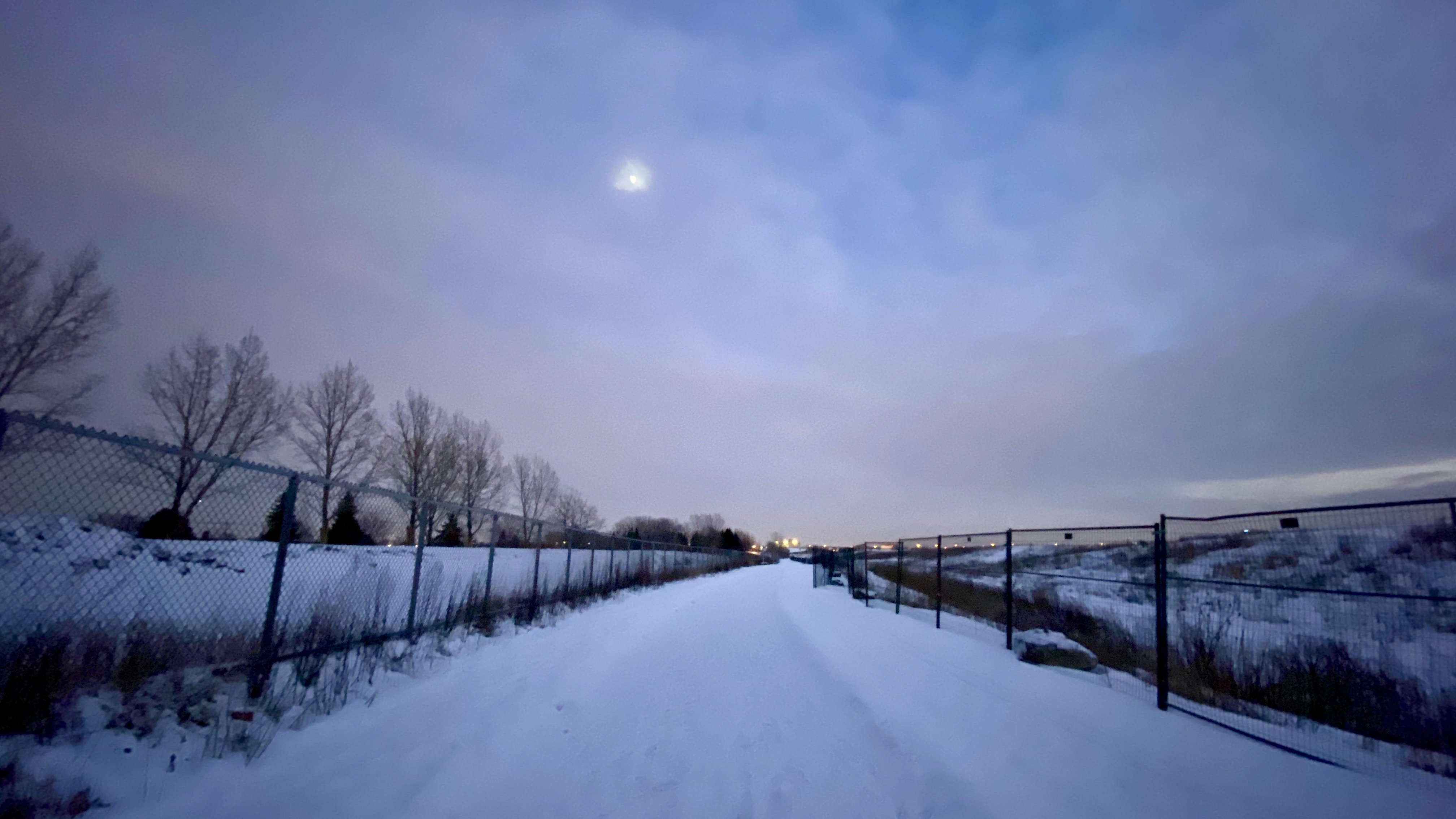 J’ai tendance à prendre mes marches de santé en milieu d’après-midi mais, avec le raccourcissement du jour en cette saison, il m’arrive souvent de me retrouver à traverser le sentier de contournement des travaux à la tombée de la nuit, ce qui est plutôt désagréable étant donné l’absence de lampadaires. Il m’est arrivé de traverser cette section du parc dans l’obscurité presque totale! Heureusement, parfois la lune éclaire le chemin — comme dans cette photo prise le 6 janvier, un peu avant 17h. Vivement la fin des travaux (novembre 2020?) et la réouverture du sentier officiel, qui sera alors doté de lampadaires!