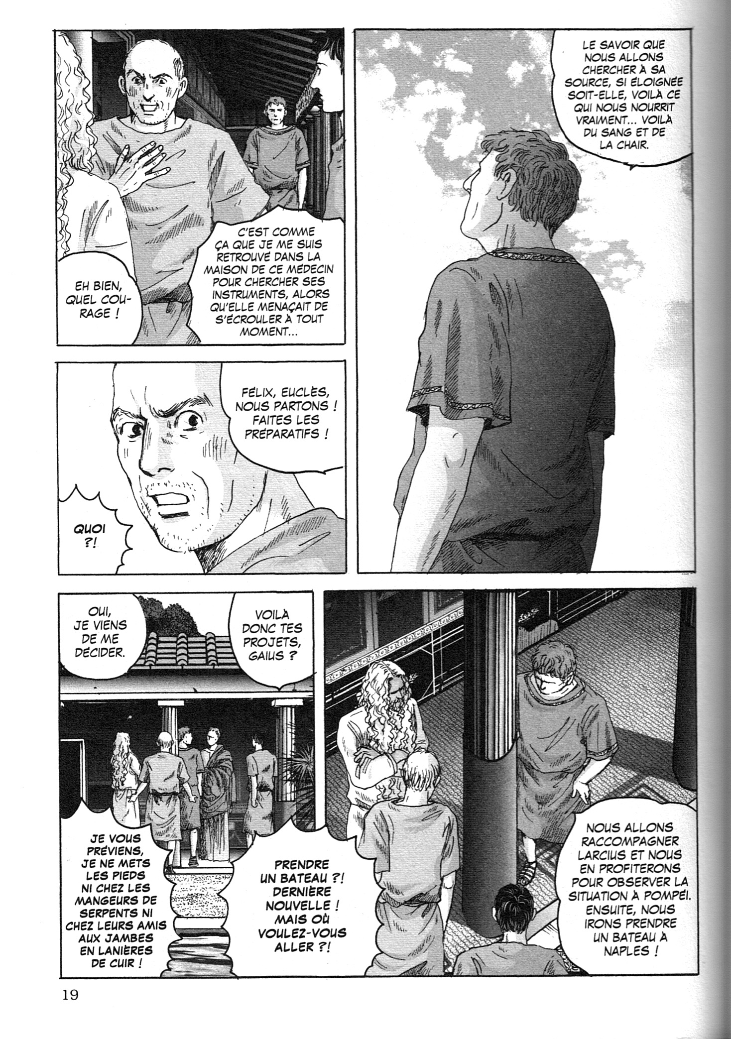Pline-v5p019Pline écoute les récits de Larcius (fils d’un négociant en vin de Pompéi qui a beaucoup voyagé) et cela lui donne l’appétit de faire ses propres voyages de découvertes. Pline, Euclès et Félix raccompagnent donc Larcius à Pompéi afin de voir comment la situation y a évolué. La reconstruction de la ville se fait de façon inégale, au gré des besoins de la politique et des moyens financiers des habitants. Ils retrouvent l’ingénieure Mirabela et font la rencontre de Aselina Eumachia, une riche et influente commerçante de la laine. Sur l’un de ses bateau, à Naples, ils prennent la mer sur la Mare Nostrum en direction de l’Afrique!
