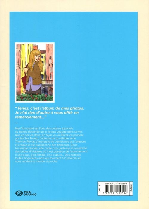 UN_SIMPLE_MONDE (Pika Graphic)_JKT_a_6.indd“Mari Yamazaki est l’une des auteurs japonais de bande dessinée qui a le plus voyagé dans sa vie. Que ce soit en Italie, en Syrie ou au Brésil en passant par les îles Tuvalu, l’auteure de la célèbre série Thermæ Romæ s’imprègne de l’ambiance qui l’entoure et croque la vie quotidienne des habitants. Dans Un Simple Monde, elle capte avec justesse et sensibilité des bribes d’histoires où il est question de l’attachement à son pays, à sa famille, à sa culture… Des histoires toutes singulières mais qui touchent à l’universel et nous rendent le monde si proche.”