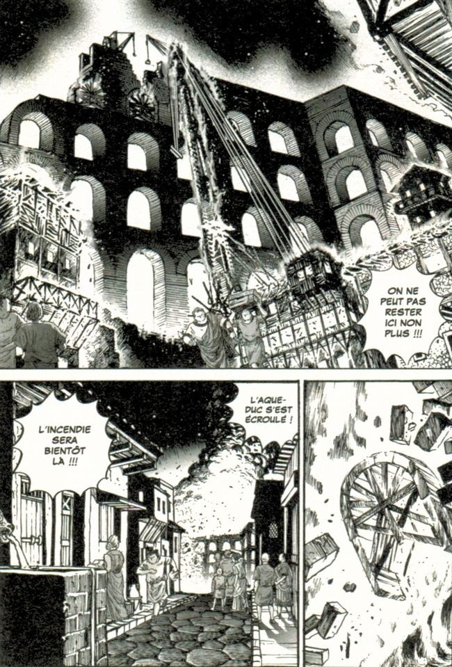 Le récit est entrecoupé par ce qui se passe à Rome, à la cour de Néron: les cauchemar que lui laissent encore les souvenirs d’une mère dominatrice, sa concubine Poppée qui le presse pour le mariage et que faire de sa femme, Octavie, qu’il a exilé dans l’île de Pandataria ? Il nous est présenté comme un artiste troublé, au caractère instable, qui n’est pas fait pour diriger un état mais qui est bien entouré, notamment par Vespasien. Après un arrêt à Puteoli pour un bain, Pline arrive enfin à Rome. Il habite dans un quartier mal famé, où se côtoient voleurs et prostitués. Il y rencontre par hasard Néron… Le volume se termine sur une interview avec les auteurs, qui discutent la genèse de leur manga.