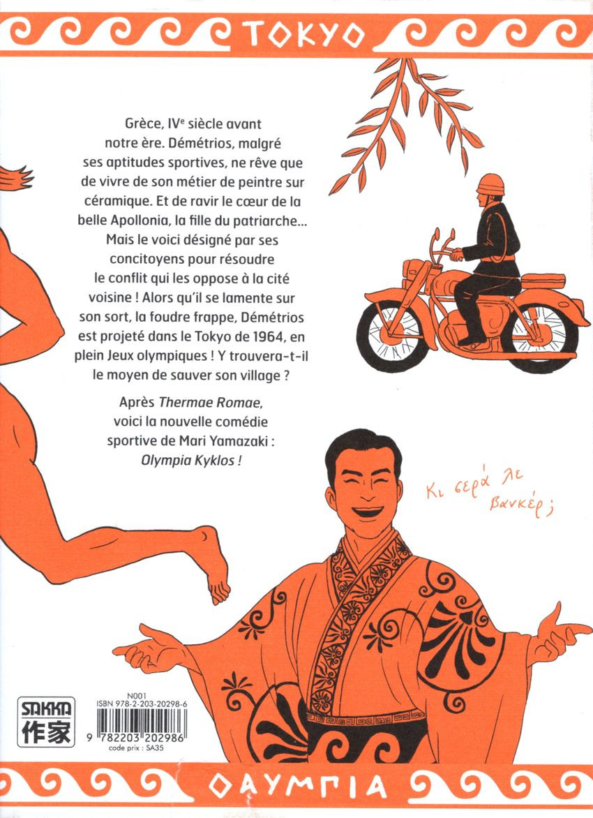 Après Thermae Romae, la nouvelle comédie sportive de Mari Yamazaki ! Démétrios, dans son petit village de la Grèce du 4e siècle avant notre ère, n’aspire qu’à une chose : vivre de son métier de peintre sur céramique. Et, peut-être, ravir le coeur de la belle Apollonia, la fille du patriarche… Le destin en décide autrement : le voici chargé de sauver son village des appétits guerriers de la cité voisine ! Alors qu’il se lamente sur son sort, la foudre frappe. Lorsqu’il reprend ses esprits, Démétrios a été projeté à travers le temps et l’espace dans le Tokyo de 1964, au moment des Jeux olympiques !”