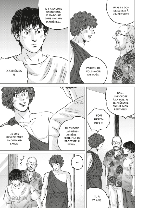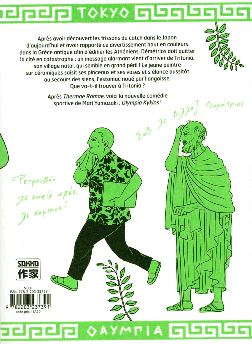 “Un nouveau péril menace la cité de Démétrios. Cette fois, c’est une épidémie qui menace de décimer Tritona ! Alors que ses concitoyens sont au plus mal, Démétrios est sommé une fois de plus par le patriarche de trouver une idée qui sauvera les siens. Sport, manga, théâtre, musique : au gré de ses allers-retours avec l’époque contemporaine, le jeune peintre sur céramiques a déjà prouvé les vertus de l’expression de soi sous bien des formes. Saura-t-il relever cet ultime défi alors qu’il atterrit dans un Japon en pleine pandémie de Covid ? Et si un autre voyageur temporel lui apportait un concours inespéré ?” [Texte de la couverture arrière]